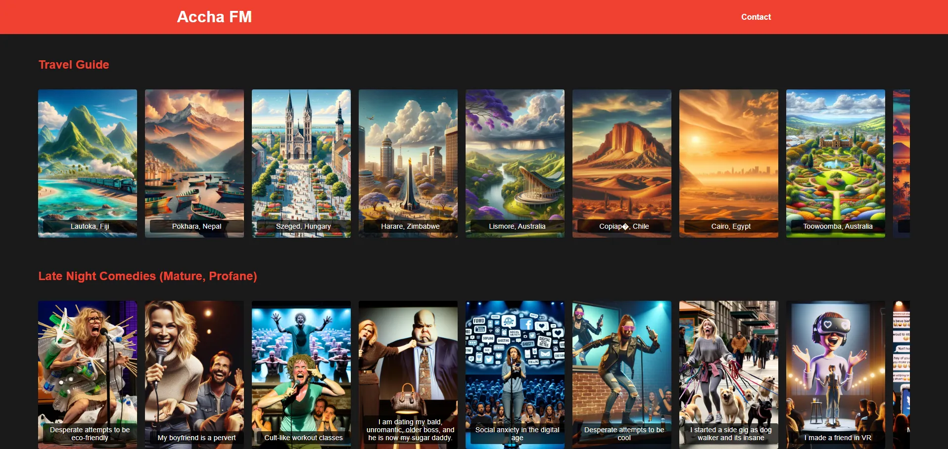 Accha FM es una súper app de entretenimiento de audio potenciada por inteligencia artificial que ofrece una amplia variedad de contenido para todos los gustos. Con Accha FM puedes disfrutar de guías de viaje narradas (Concepción, Chile; Negril, Jamaica), comedias nocturnas y relatos sobre la vida moderna (citas, crianza), resúmenes de libros de crecimiento personal, enigmas históricos y científicos, además de recetas culinarias guiadas por audio.