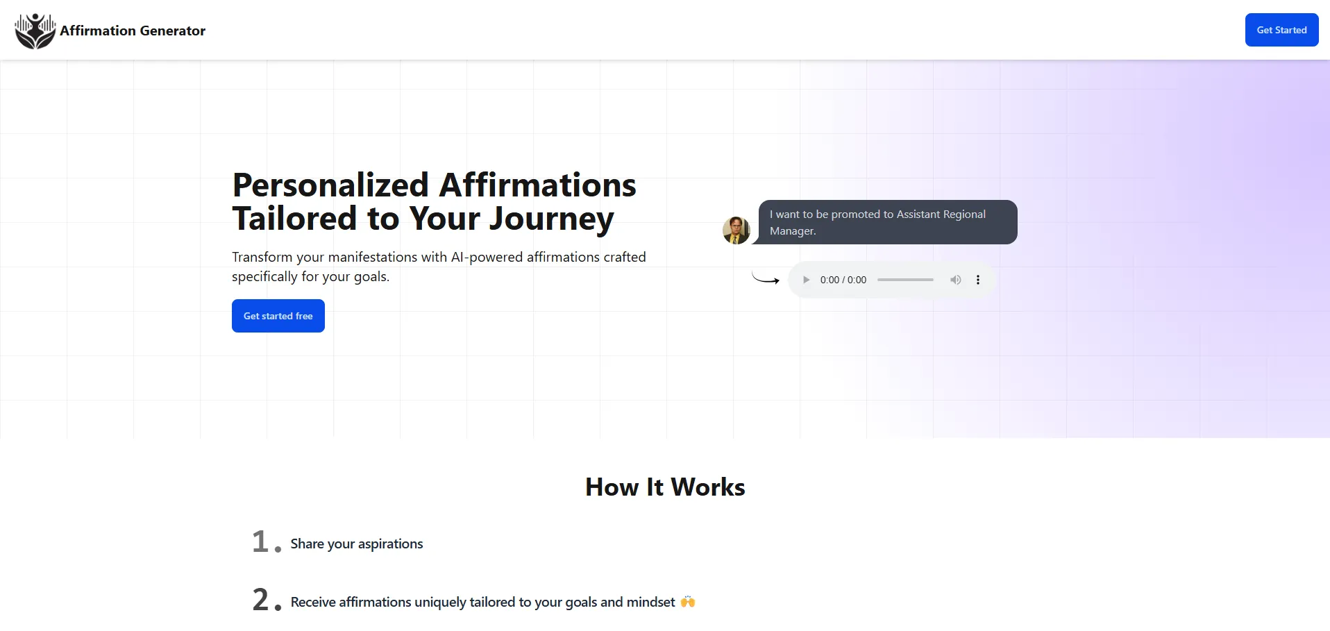 El Generador de Afirmaciones es una herramienta de IA personalizada que crea pistas de afirmaciones diseñadas para tus metas y aspiraciones. Permite introducir objetivos específicos y recibir audios con mensajes alineados a tu mentalidad y resultados deseados. Ofrece una selección de sonidos de fondo relajantes —música suave, ambientes naturales y tonos atmosféricos—, opciones de intervalos entre afirmaciones y la posibilidad de descargar las pistas para escucharlas sin conexión. Con un enfoque interactivo, convierte tus manifestaciones en realidad y potencia tu crecimiento personal.