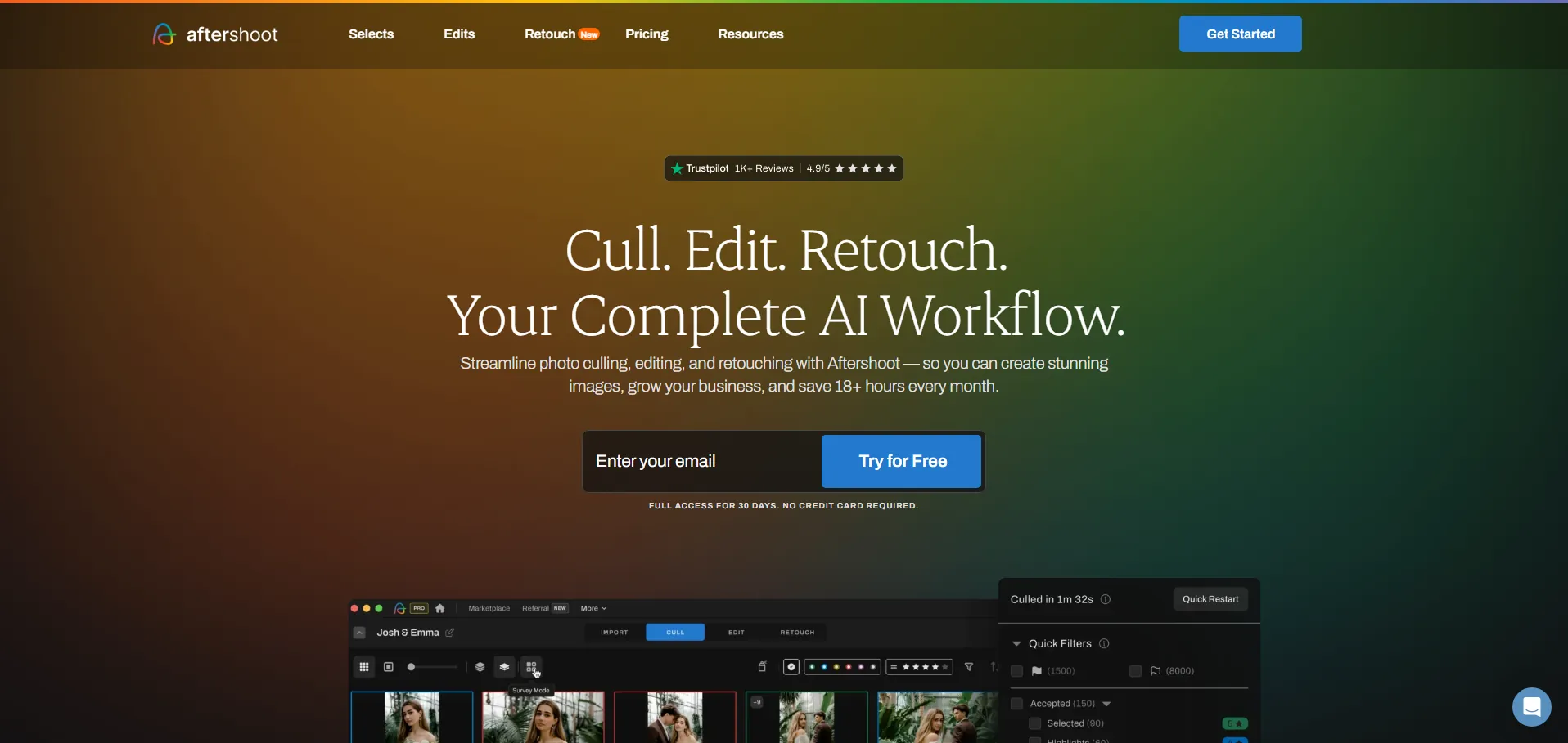 AfterShoot es una herramienta de selección y edición de fotos impulsada por inteligencia artificial, diseñada para acelerar tu flujo de trabajo fotográfico. Con detección automática de duplicados, fotos borrosas y ojos cerrados, ajustes inteligentes por lotes y compatibilidad con formatos RAW, AfterShoot permite procesar miles de imágenes en minutos. Más de 50 000 profesionales aprovechan su prueba gratuita de 30 días para ahorrar tiempo y centrarse en la parte creativa de su negocio.