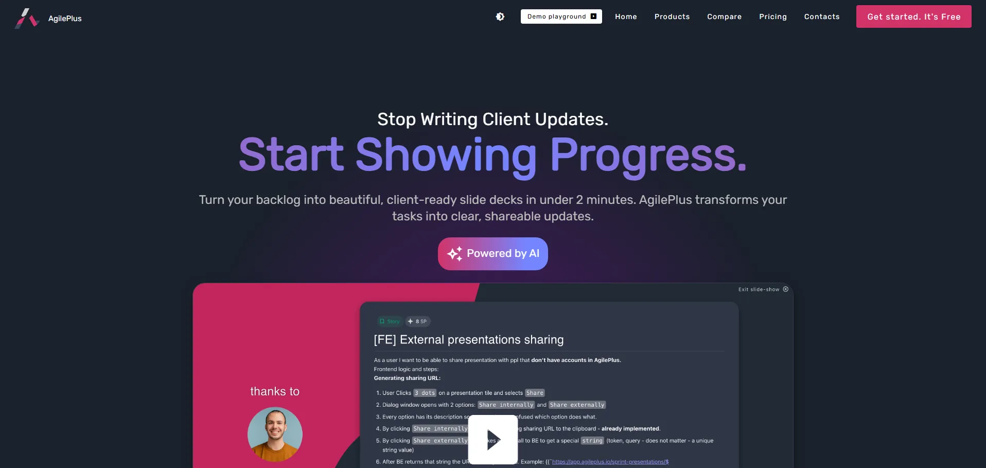 AgilePlus es una herramienta de productividad para equipos que siguen metodologías ágiles. Automatiza tareas administrativas, garantiza la coherencia de los datos gracias a su integración nativa con Jira y genera presentaciones de sprint con IA para acelerar la toma de decisiones. Facilita las sesiones de refinamiento reutilizando plantillas y ofrece planes escalables que se adaptan a equipos de todos los tamaños, con opciones gratuitas y premium e integraciones adicionales como Trello y Slack.