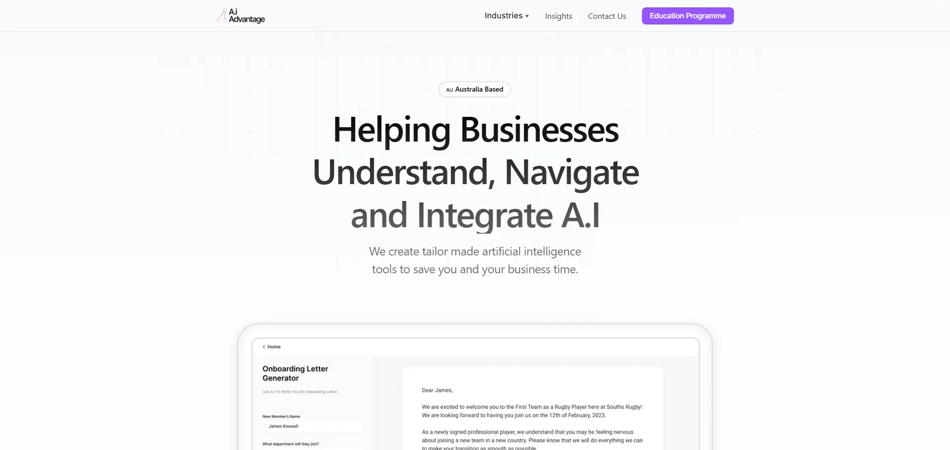 AI Advantage es una consultora australiana de inteligencia artificial que ayuda a empresas de todos los tamaños e industrias a comprender, diseñar e integrar soluciones de IA a medida. Su equipo experto colabora con los clientes para desarrollar herramientas personalizadas, como generadores automáticos de cartas de incorporación, y ofrece servicios de análisis de procesos, diseño de estrategias de IA y recomendaciones de tecnología. Además, imparte programas de formación especializados para que el personal aproveche al máximo los modelos de IA y mejore la eficiencia operativa.