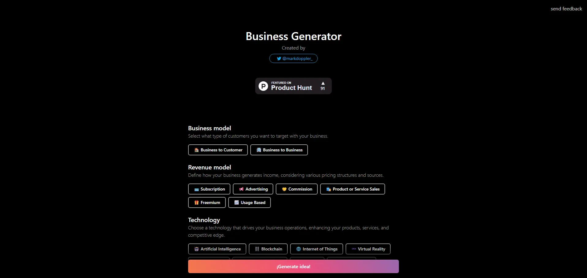 Accede al sitio oficial del Generador de Ideas de Negocio con IA para consultar documentación, tutoriales y soporte. Sigue sus canales en redes sociales para recibir actualizaciones y novedades.
