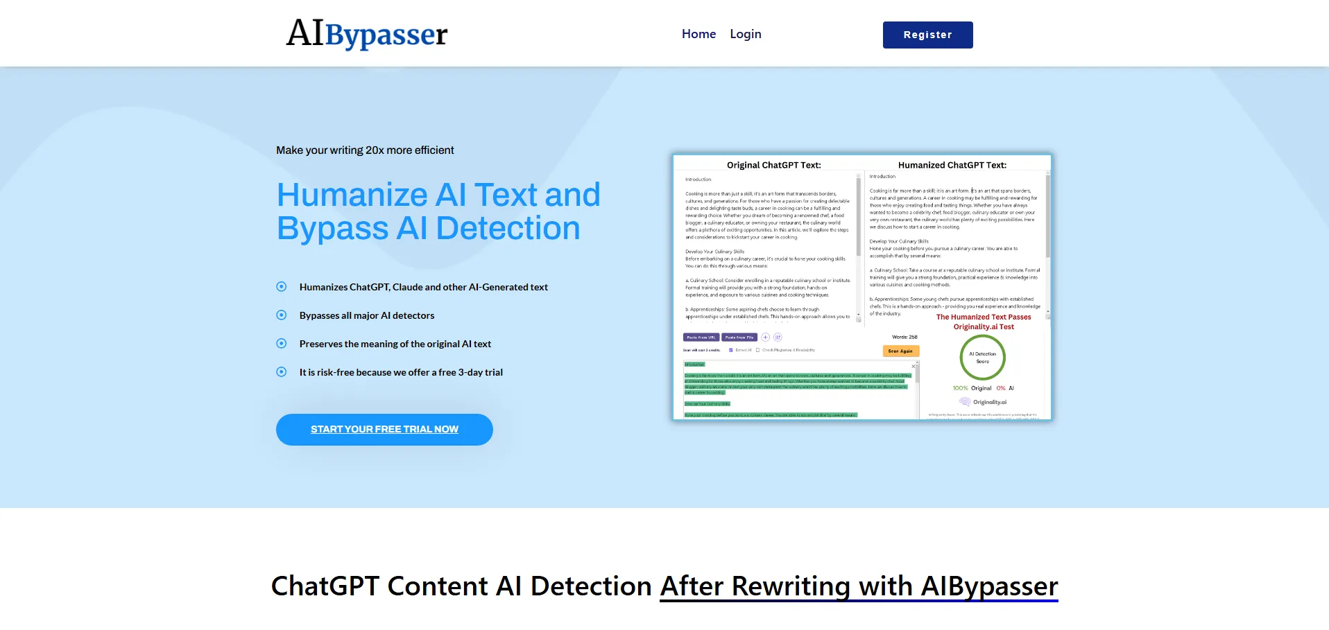Diseñada específicamente para procesar contenido generado por modelos como ChatGPT y Claude, Ai Bypasser permite que los textos superen los sistemas de detección de IA más populares, como Originality.ai, Copyleaks y GPTZero. Además de mejorar la legibilidad, también optimiza el contenido para SEO, lo que ayuda a atraer más lectores y mejorar el posicionamiento en motores de búsqueda.