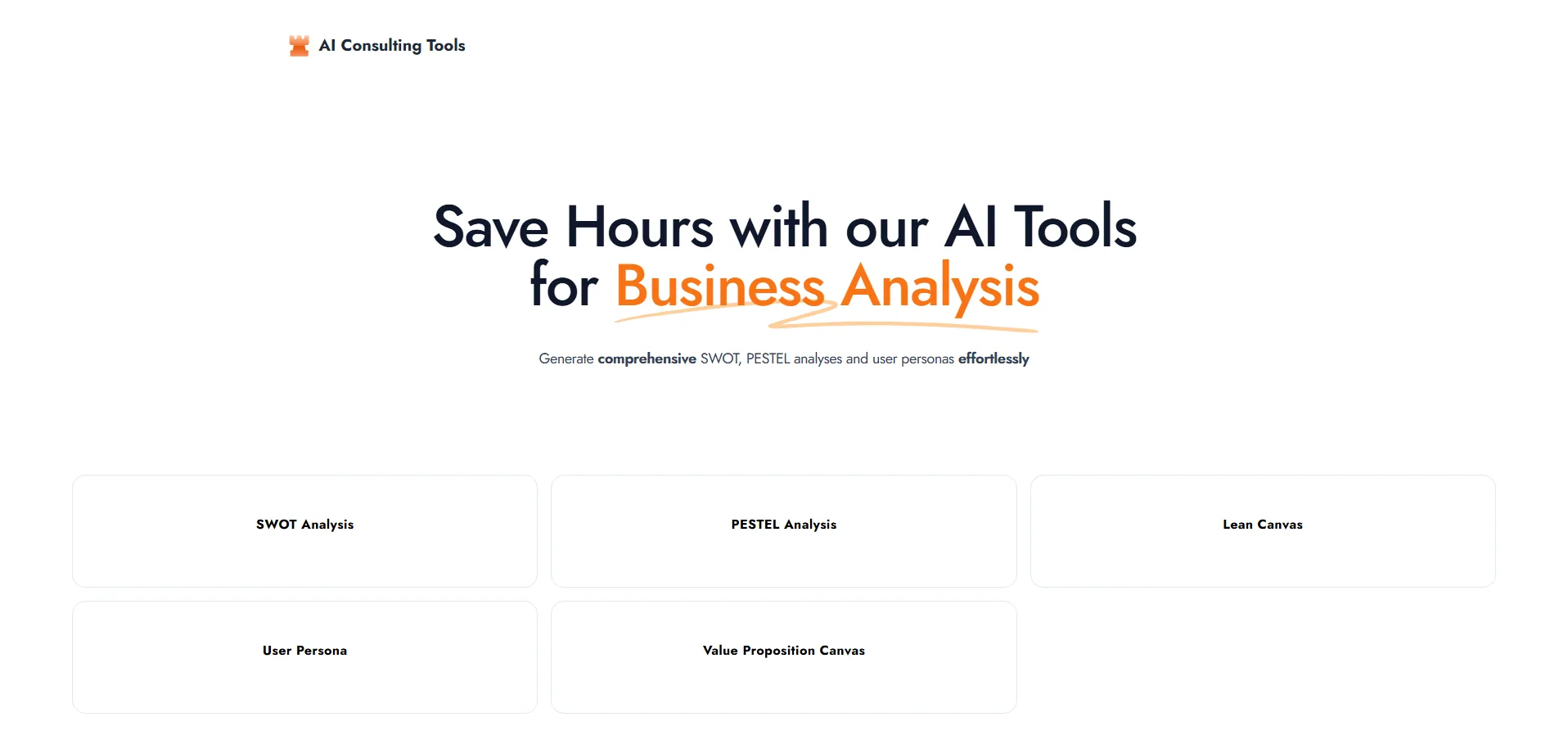 Las herramientas de consultoría de IA son una plataforma de productividad alimentada por inteligencia artificial, diseñada para profesionales de la consultoría. Permiten generar análisis FODA, perfiles de usuario, lienzos Lean y estudios PESTEL de forma automatizada. Con una interfaz intuitiva y soporte técnico especializado, estas herramientas ahorran horas de trabajo al producir informes y recomendaciones estratégicas en tiempo récord.