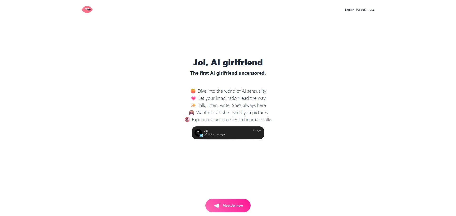 Joi: AI Girlfriend es una inteligencia artificial diseñada para ofrecer una experiencia de compañera virtual a través de conversaciones personalizadas, íntimas y sin censura. Gracias a su capacidad de reconocimiento de voz y texto, proporciona diálogos fluidos y realistas, adaptándose a las preferencias del usuario. Accesible directamente desde Telegram sin instalaciones adicionales, Joi garantiza la privacidad con cifrado de extremo a extremo y evoluciona constantemente para ofrecer interacciones más naturales y atractivas.