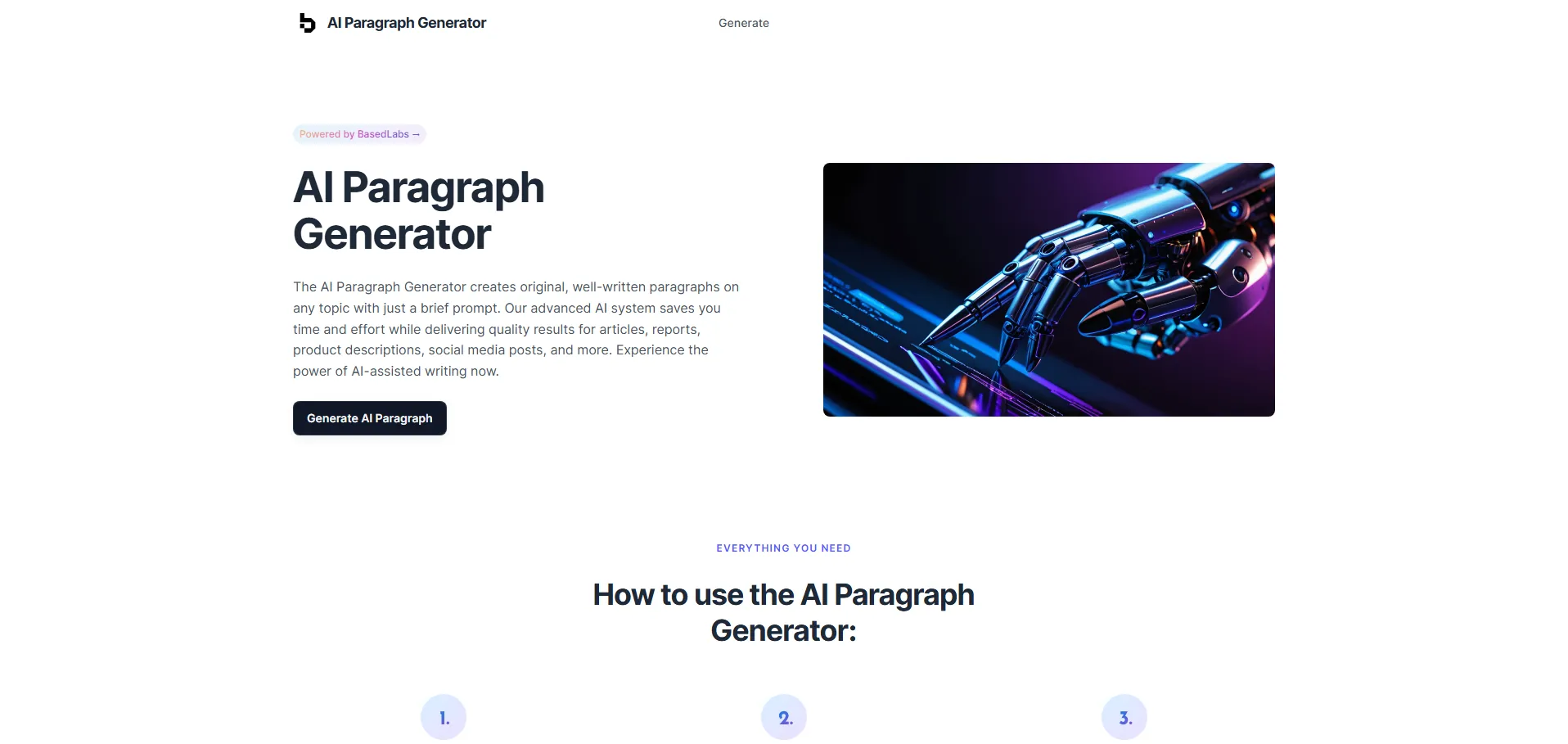 El Generador de Párrafos con IA de BasedLabs es una herramienta innovadora que aprovecha inteligencia artificial de última generación para crear párrafos coherentes y originales a partir de una breve indicación. Diseñada para optimizar la generación de contenido en blogs, informes, descripciones de productos, publicaciones en redes sociales y más, esta solución acelera el flujo de trabajo al ofrecer textos listos para editar o publicar. Solo necesitas ingresar tu tema y palabras clave, ajustar parámetros como tono y longitud, y obtener párrafos únicos que mantienen un estilo profesional y consistente, ayudándote a superar el bloqueo creativo y mejorar tu productividad.