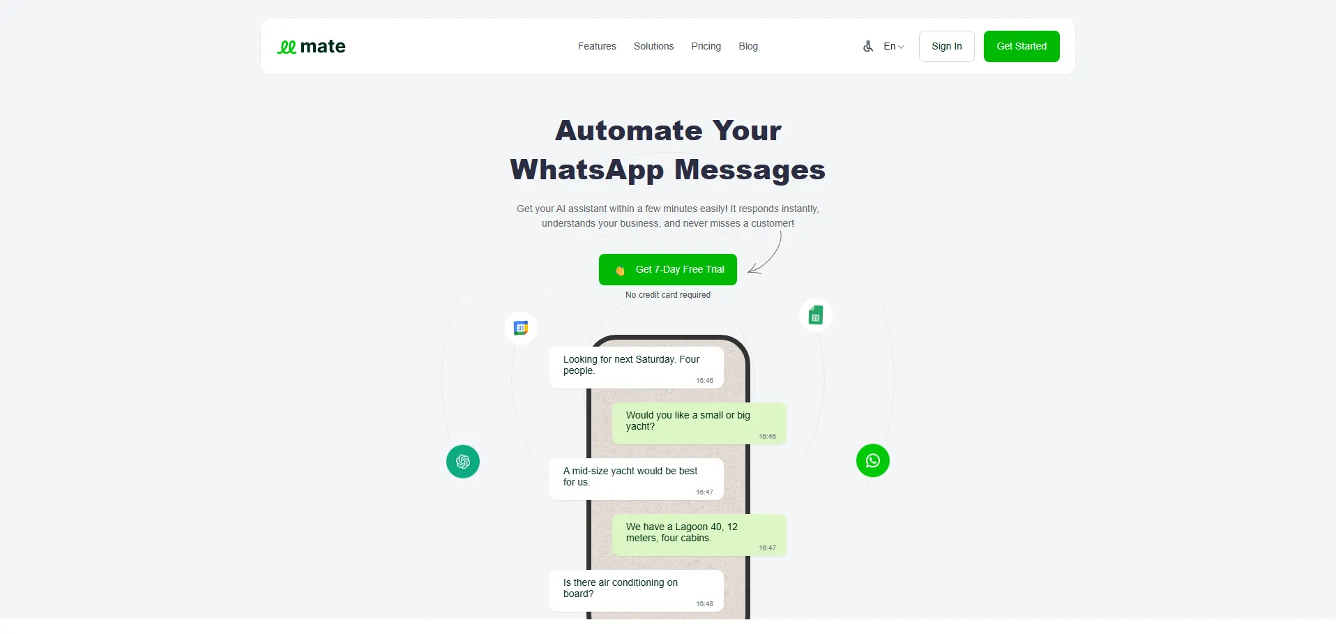 El Asistente de WhatsApp con IA de Mate Direct es un chatbot inteligente que automatiza la atención al cliente en WhatsApp. Se configura en menos de dos minutos para ofrecer respuestas inmediatas y continuas, garantizando que ningún mensaje quede sin atender. Su compatibilidad multilingüe y su base de conocimientos personalizable aseguran interacciones coherentes y precisas. Además, la integración con Hojas de Cálculo de Google permite acceder y actualizar datos en tiempo real, mientras que el resumen automático de conversaciones deriva a los usuarios hacia los servicios adecuados.