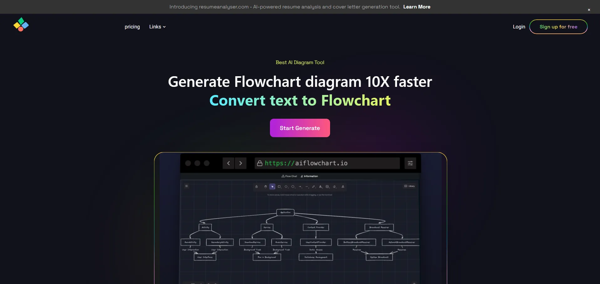 aiflowchart es una herramienta de generación de diagramas impulsada por inteligencia artificial que transforma texto, archivos PDF y contenido web en representaciones visuales claras. Con soporte para diagramas de flujo, secuencias, gráficos circulares y otros formatos, simplifica la documentación y comunicación de procesos. Su motor de IA analiza la información de diversas fuentes y genera automáticamente esquemas personalizables, optimizando la productividad y mejorando la comprensión de proyectos.