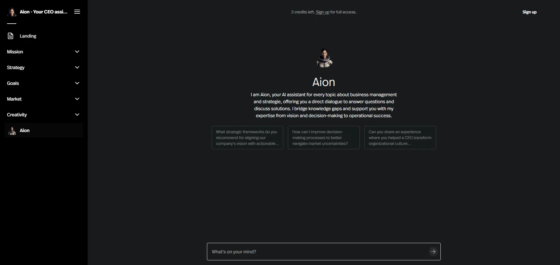 Aion es un asistente corporativo potenciado por inteligencia artificial, diseñado para optimizar la gestión ejecutiva y perfeccionar la toma de decisiones estratégicas. Integra herramientas para definir y alinear objetivos con el propósito empresarial, realizar análisis de mercado mediante marcos como Seis Sombreros y PESTEL, generar y verificar OKR, y facilitar la colaboración en grupos asesores de alto nivel. Su función Trendspotter detecta tendencias emergentes, manteniendo a las organizaciones un paso adelante en un entorno competitivo.