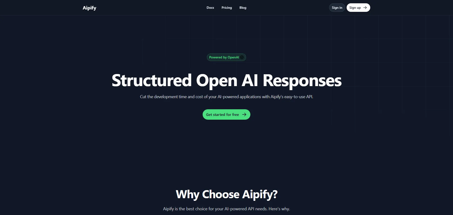 Aipify es una plataforma de creación de APIs basadas en IA que permite desplegar endpoints inteligentes en cuestión de segundos. Ofrece acceso a los modelos de lenguaje más avanzados, incluido GPT-4, y garantiza respuestas estructuradas en JSON, con una infraestructura de baja latencia y alta disponibilidad. Su enfoque en la seguridad y el escalado automático reduce costes y acelera el time-to-market de aplicaciones con capacidades de IA.