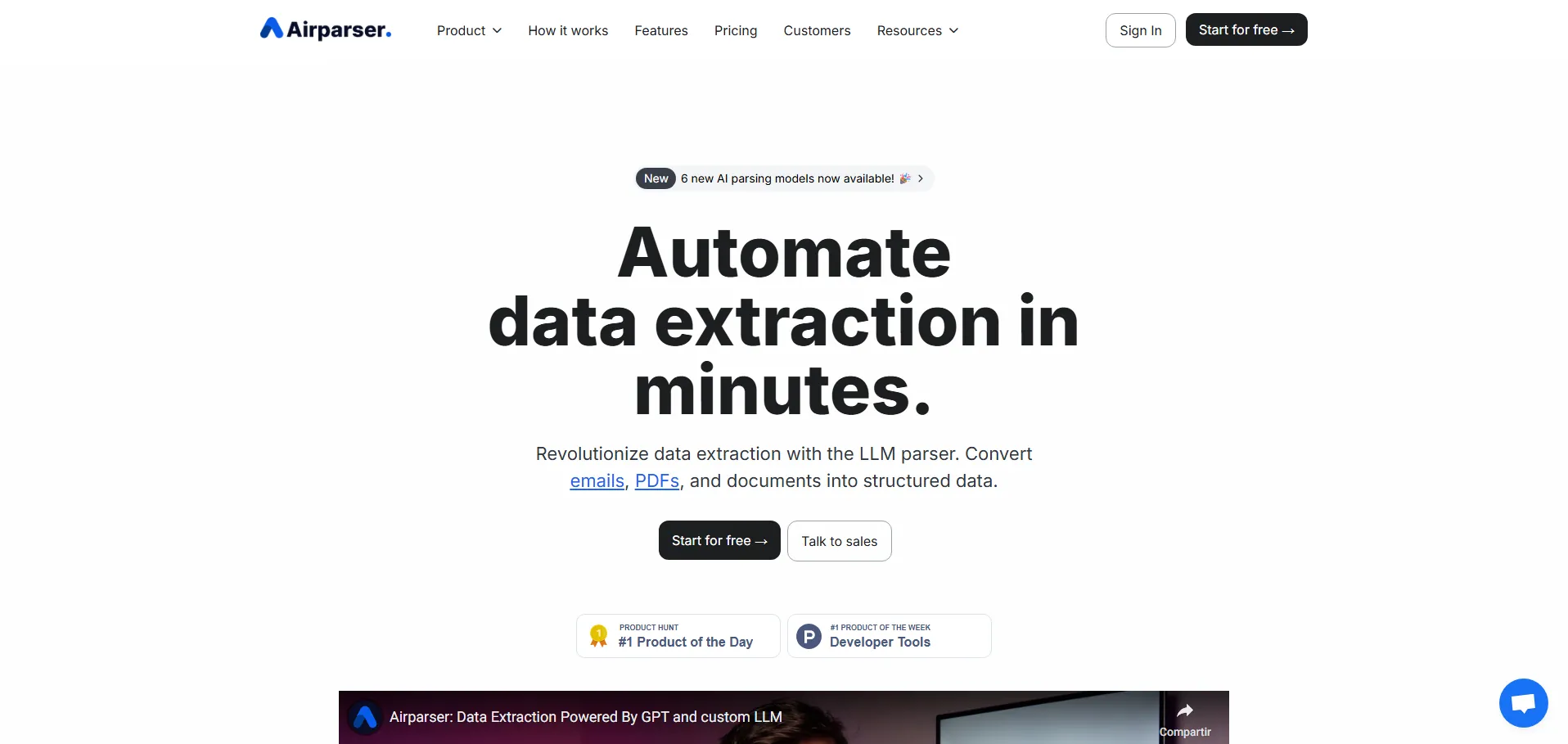 Airparser es una solución de inteligencia artificial especializada en la extracción automatizada de datos. Emplea un motor de análisis basado en GPT para convertir correos electrónicos, archivos PDF, documentos y textos manuscritos en información estructurada. Con solo tres pasos sencillos, identifica firmas, contactos, fechas, datos de facturas, currículums y más. Además, se integra vía API, webhooks o con más de 6000 aplicaciones para agilizar procesos y elevar la precisión de tu flujo de trabajo.