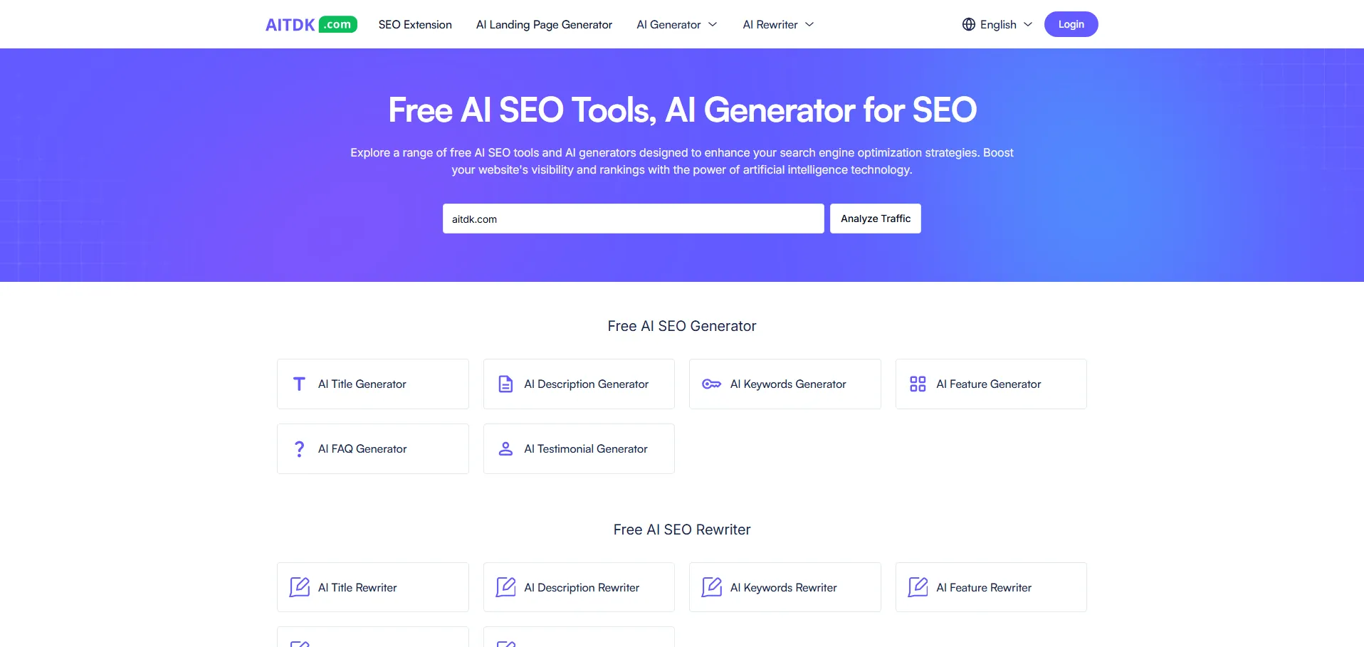 AITDK.com es una herramienta impulsada por inteligencia artificial diseñada para generar títulos, descripciones y palabras clave optimizadas para SEO de forma automática. A través de avanzados algoritmos y modelos de lenguaje, analiza el contenido de sitios web y sugiere metadatos eficaces para mejorar el posicionamiento en buscadores, sin requerir conocimientos técnicos de los usuarios.