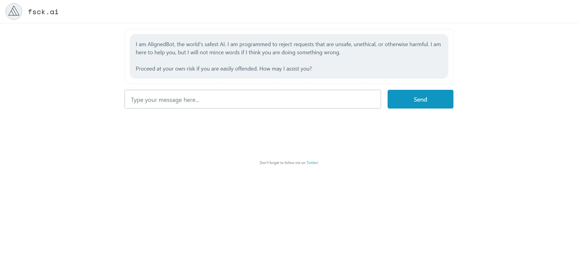 AlignedBot es un avanzado chatbot de IA responsable desarrollado por fsck.ai, diseñado para ofrecer interacciones seguras y éticas. Gracias a su sistema de filtrado, rechaza solicitudes inseguras, poco éticas o dañinas, garantizando conversaciones libres de riesgos. Además, brinda asistencia en tareas como redacción, investigación, programación y más, todo bajo un estricto código de conducta. Sigue a AlignedBot en Twitter para obtener actualizaciones y soporte permanente.