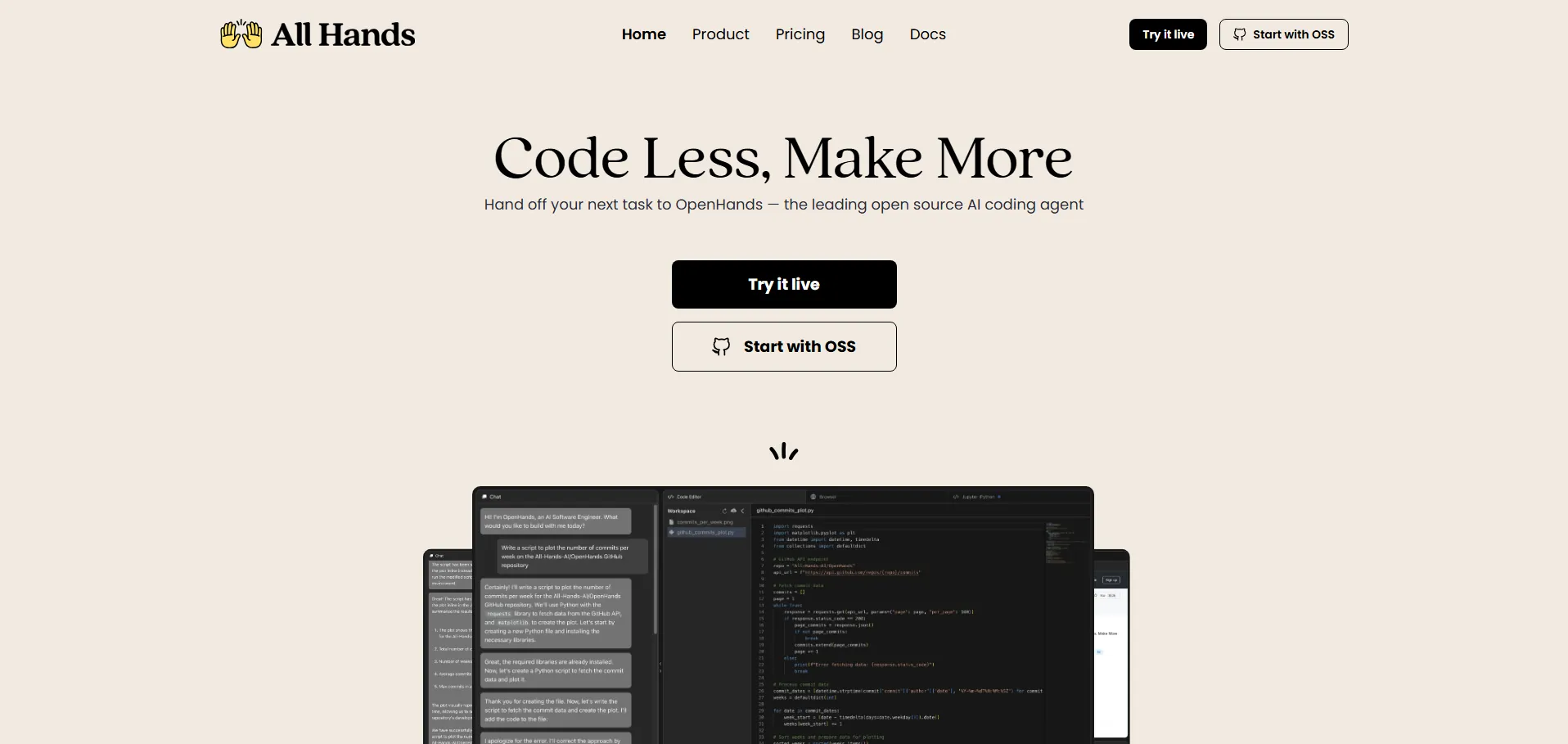 All Hands AI es una plataforma de código abierto diseñada para optimizar las tareas de ingeniería de software mediante la automatización de procesos repetitivos y la mejora de la productividad del desarrollador. Con funciones avanzadas de generación de código, ejecución de comandos y acceso a conjuntos de problemas verificados, permite a programadores e ingenieros enfocarse en retos creativos y soluciones complejas. Su comunidad global de más de 39 000 usuarios y 200 colaboradores promueve el desarrollo responsable de la IA y facilita la colaboración en proyectos de software.