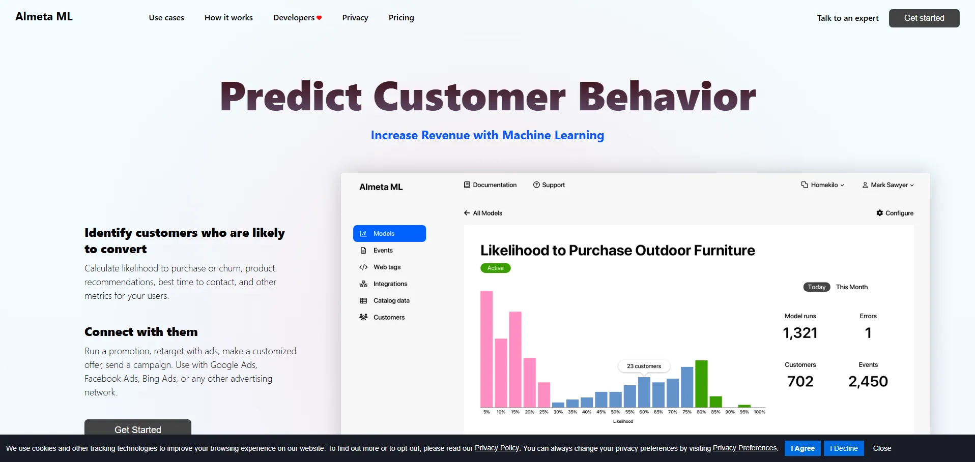 Almeta ML es una herramienta de análisis predictivo basada en aprendizaje automático, diseñada para interpretar y pronosticar el comportamiento de los clientes en plataformas digitales. Compatible con múltiples idiomas (inglés, español, francés y más), emplea algoritmos avanzados que permiten a las empresas tomar decisiones basadas en patrones de datos reales. Su interfaz intuitiva y sus opciones de cumplimiento de la privacidad facilitan la gestión de preferencias y el análisis de conjuntos de datos complejos, mejorando las estrategias de marketing y la interacción con el cliente.