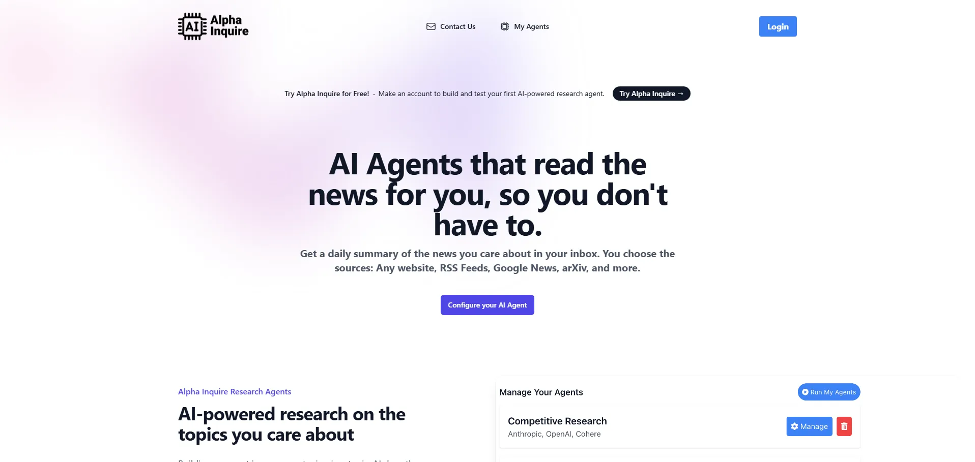 La herramienta ejecuta búsquedas diarias y genera resúmenes personalizados sobre los temas configurados, enviando los resultados directamente al correo electrónico del usuario. Ya sea para seguir noticias, artículos de investigación o tendencias del mercado bursátil, AlphaInquire ofrece una forma eficiente de mantenerse informado con contenido relevante y actualizado.