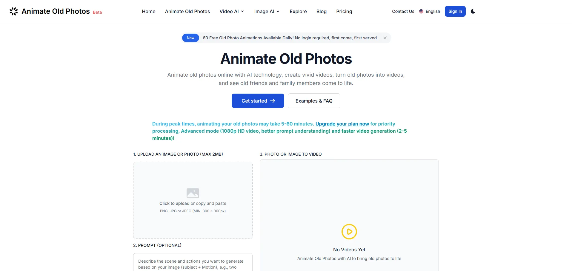 Animate Old Photos es una herramienta en línea potenciada por inteligencia artificial que convierte fotografías estáticas en vídeos animados de alta calidad. Permite subir imágenes en formatos PNG, JPG y JPEG (hasta 2 MB) para aplicar movimientos faciales, expresiones y gestos, todo personalizado mediante subtítulos o indicaciones de texto. Su interfaz intuitiva ofrece resultados profesionales en cuestión de minutos, con mejoras futuras previstas como restauración automática, colorización de fotos en blanco y negro y añadidos musicales.