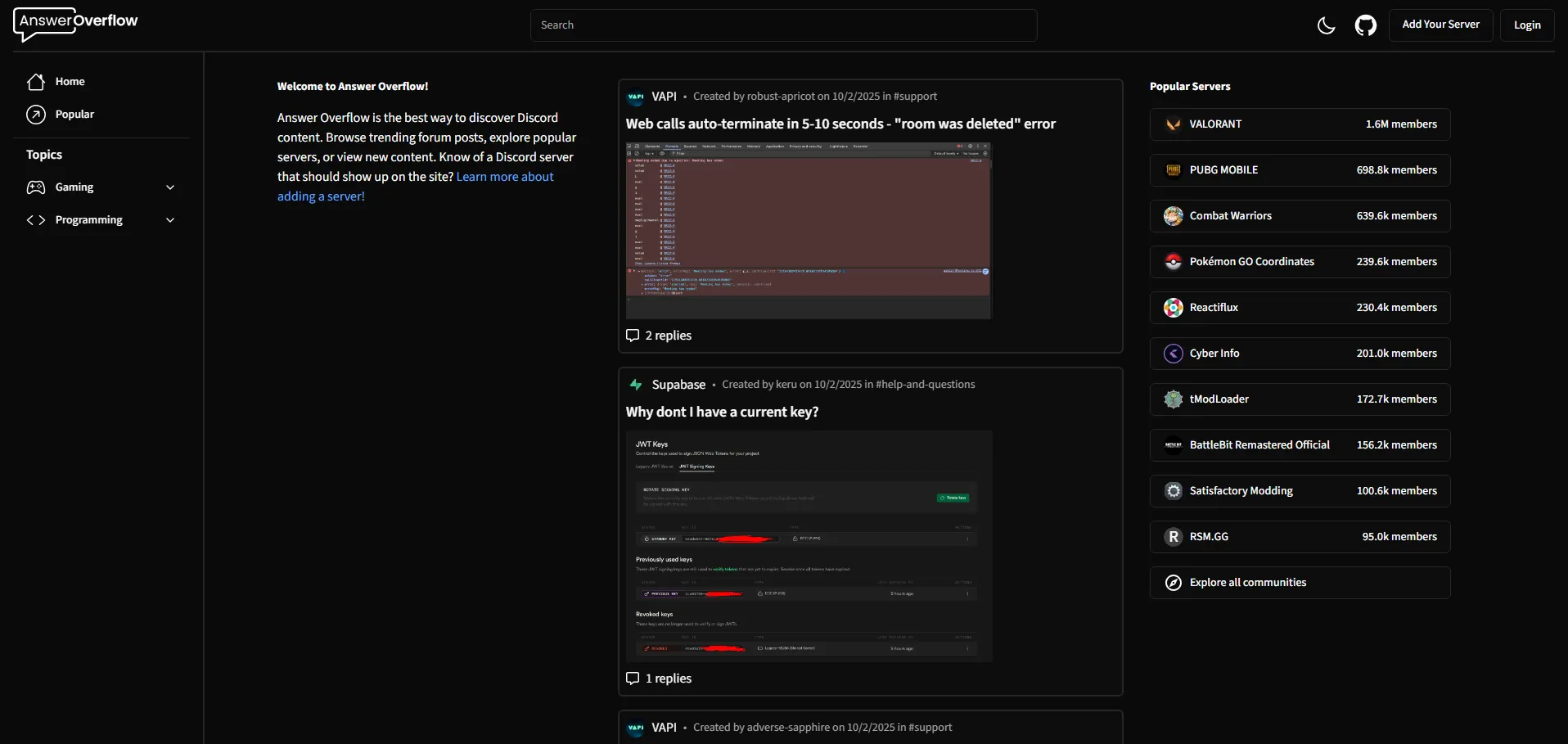 Answer Overflow es un motor de búsqueda para Discord que utiliza inteligencia artificial para indexar y localizar mensajes, canales y archivos en múltiples comunidades. De código abierto bajo licencia MIT y de uso gratuito, facilita la exploración eficiente de debates y recursos, permitiendo a los usuarios añadir servidores, realizar búsquedas avanzadas y descubrir contenido valioso sin perderse entre hilos extensos.