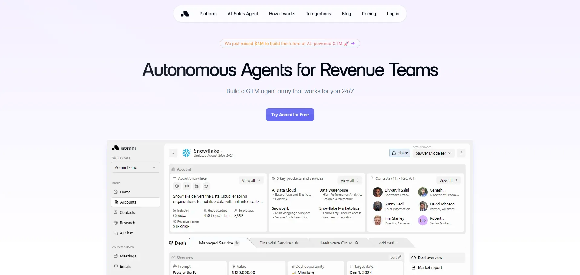 Aomni Agent es una plataforma de inteligencia empresarial impulsada por IA que automatiza la investigación y generación de perfiles de clientes ideales (PCI). Su agente de IA personalizado realiza navegación web autónoma, planificación de cuentas y creación de contenido basado en fuentes fiables. Gracias a su tecnología patentada de consultas inteligentes, Aomni optimiza la identificación de prospectos, sintetiza información compleja en informes claros y personaliza mensajes de venta adaptados a la propuesta de valor de tu producto, todo en una interfaz visualmente interactiva.