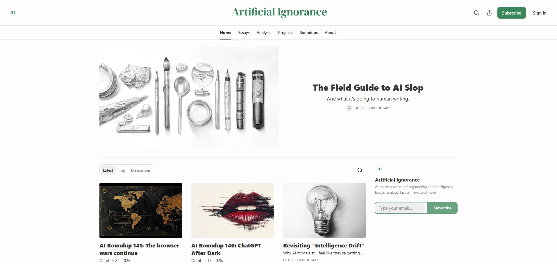 Ignorancia Artificial es un boletín de inteligencia artificial creado por Charlie Guo que ofrece análisis detallados de proyectos, ensayos exclusivos, noticias y entrevistas con expertos. Con más de 7.000 suscriptores, proporciona perspectivas avanzadas sobre las últimas tendencias y futuras aplicaciones de la IA, ayudando a profesionales y entusiastas a mantenerse informados y a profundizar en el conocimiento del sector.