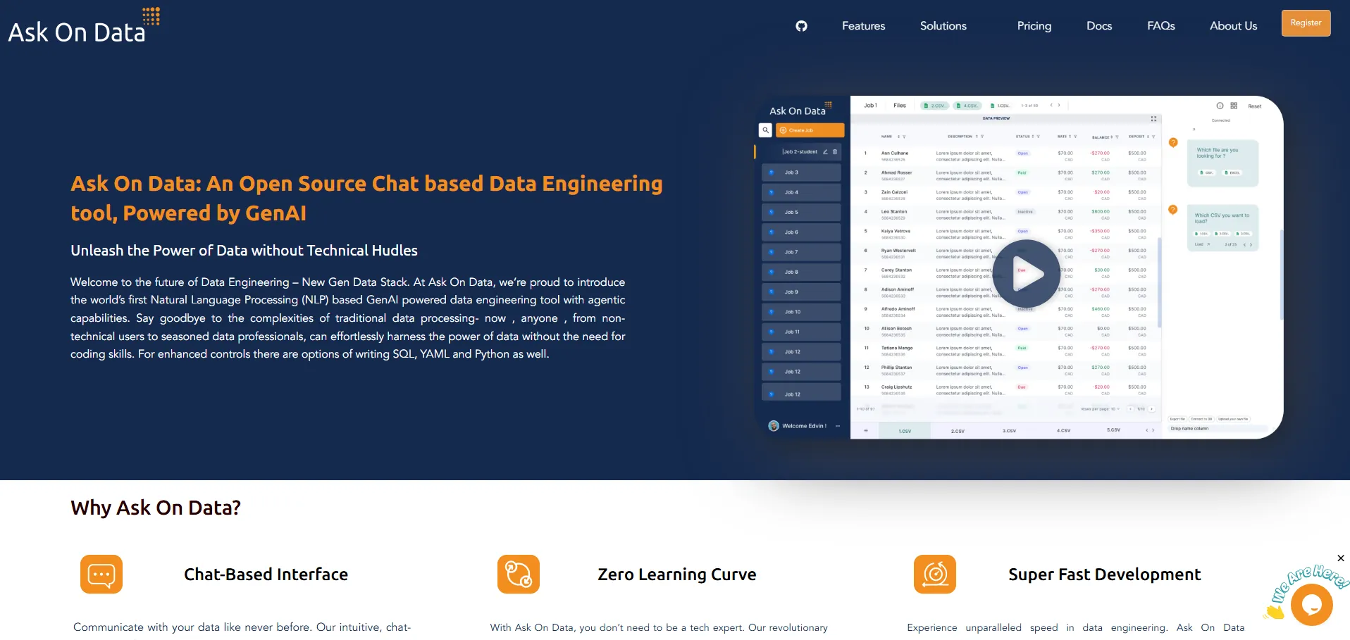Ask On Data es una plataforma de ingeniería de datos de código abierto impulsada por GenAI y basada en chat, que permite crear, gestionar y automatizar pipelines de datos mediante comandos de lenguaje natural. Su interfaz intuitiva elimina la necesidad de programar, ofreciendo integración, limpieza y transformación de datos eficientes. Con vistas previas en tiempo real, programación de tareas y compatibilidad con múltiples fuentes (bases de datos, data lakes, API), Ask On Data democratiza el acceso a la ingeniería de datos para usuarios técnicos y no técnicos, mientras sus servicios gestionados garantizan operación y mantenimiento sin preocupaciones.