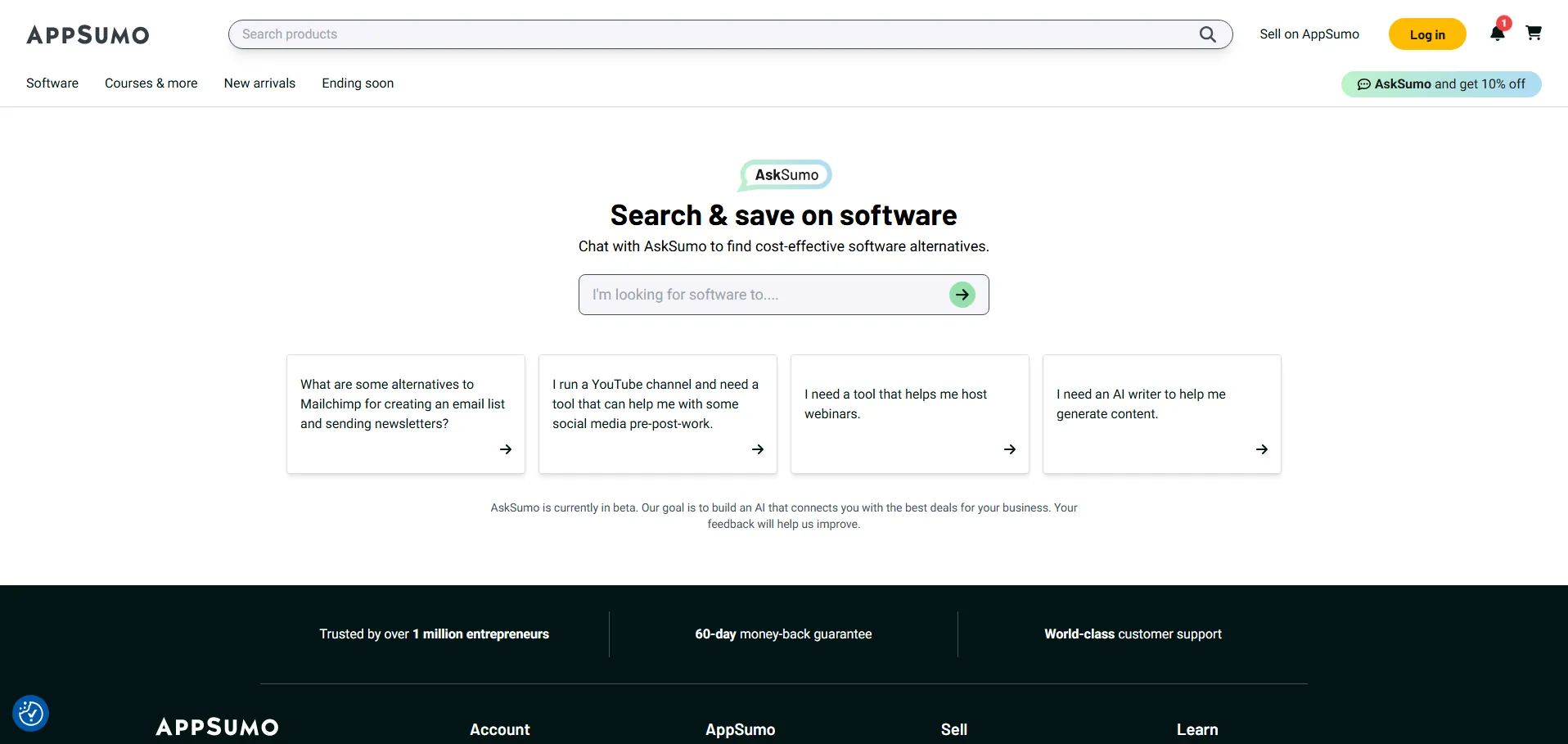 Ask Sumo es un asistente de compras personal impulsado por IA que facilita la búsqueda de ofertas de software adaptadas a tus necesidades. Integrado con AppSumo, permite ahorrar dinero en cursos y herramientas digitales mediante recomendaciones personalizadas y alertas de descuentos.
