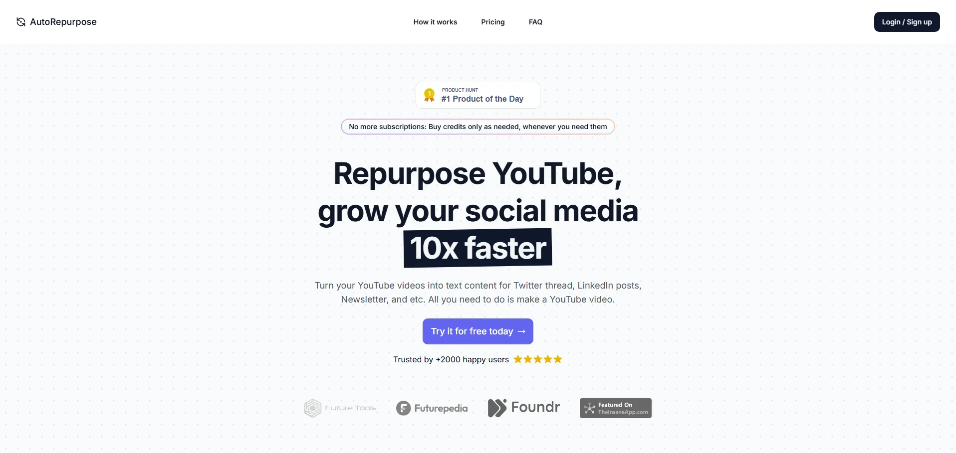 AutoRepurpose es una herramienta de transformación de contenido que convierte tus vídeos de YouTube en distintos formatos de texto, como hilos de Twitter, publicaciones de LinkedIn y boletines informativos. Simplemente pega la URL del vídeo, elige el formato deseado y recibe el contenido optimizado en minutos. Ideal para creadores de contenido y profesionales del marketing que buscan maximizar su visibilidad y reutilizar eficientemente el contenido de vídeo original.