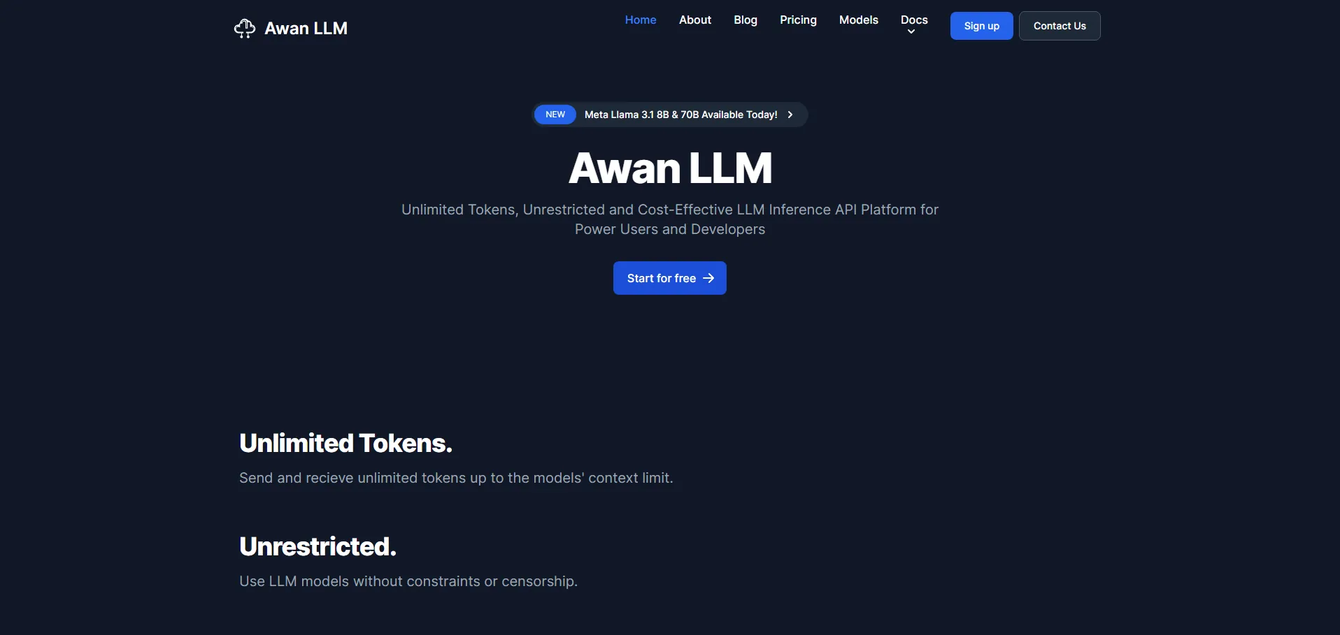 Awan LLM es una plataforma API de inferencia de IA que ofrece acceso ilimitado a tokens y compatibilidad con grandes modelos de lenguaje como Meta LLaMA 3.1. Diseñada para desarrolladores y usuarios avanzados, permite procesar texto a gran escala, generar código y crear aplicaciones basadas en IA sin restricciones de uso ni censura. Su configuración rápida y guía de inicio intuitiva facilitan la integración en proyectos para desplegar chatbots, asistentes de programación y soluciones conversacionales de alto rendimiento.