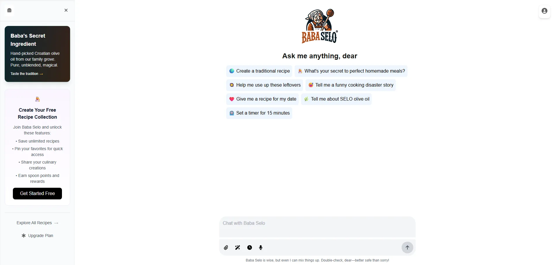 Visita el sitio oficial de Baba Selo para registrarte y acceder al generador de recetas con IA. Disponible también como aplicación móvil para iOS y Android. Encuentra tutoriales, preguntas frecuentes y soporte técnico en la sección de ayuda.