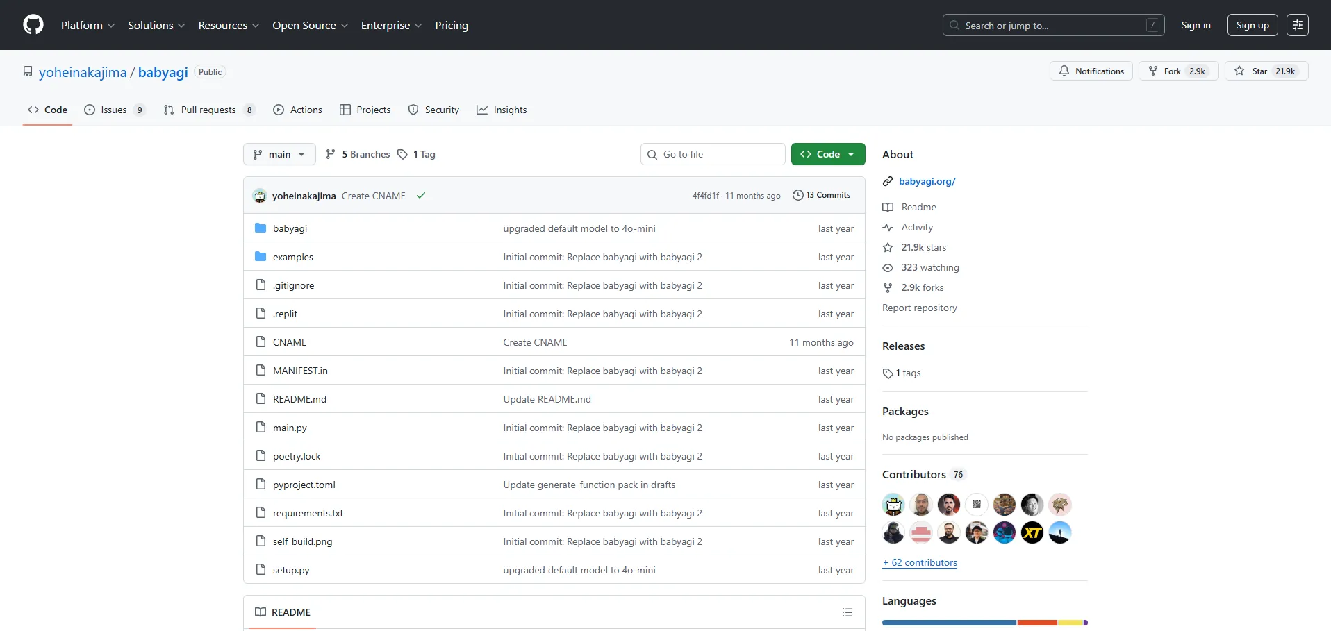Baby AGI es un sistema de gestión de tareas de código abierto disponible en GitHub. Emplea procesamiento del lenguaje natural e inteligencia artificial para generar, ejecutar y priorizar tareas basadas en resultados previos y objetivos definidos. Utiliza la API de OpenAI para repriorizar dinámicamente las tareas y almacena la información en una base de datos Chroma. Incluye scripts en Python, Dockerfiles y un archivo requirements.txt para facilitar su instalación, y cuenta con una comunidad activa que mejora continuamente su código y funcionalidades.