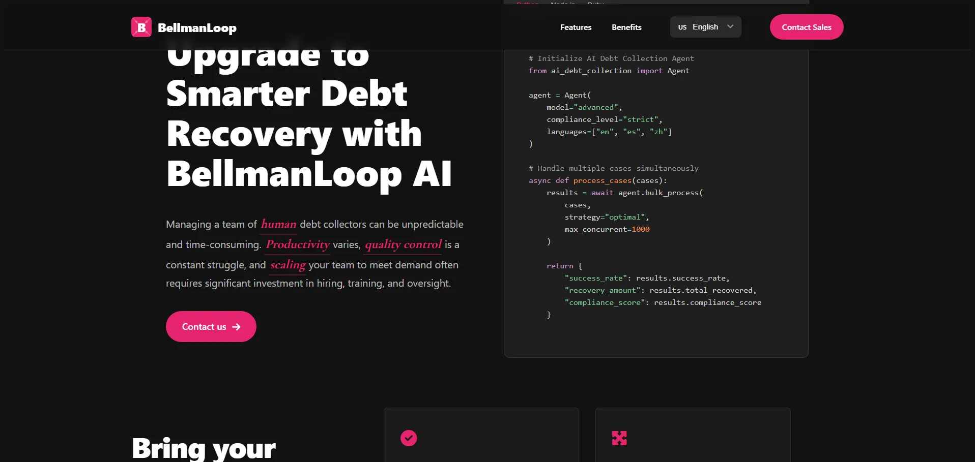 BellmanLoop es una plataforma de cobro de deudas impulsada por inteligencia artificial que optimiza cada fase del proceso de recuperación. Mediante flujos de trabajo automatizados y análisis de IA en tiempo real, gestiona múltiples casos simultáneamente, eleva las tasas de recuperación y asegura el cumplimiento normativo. Su arquitectura escalable y multilingüe facilita la ampliación de operaciones y la comunicación coherente en distintos canales, reduciendo costes operativos y mejorando la experiencia del cliente.