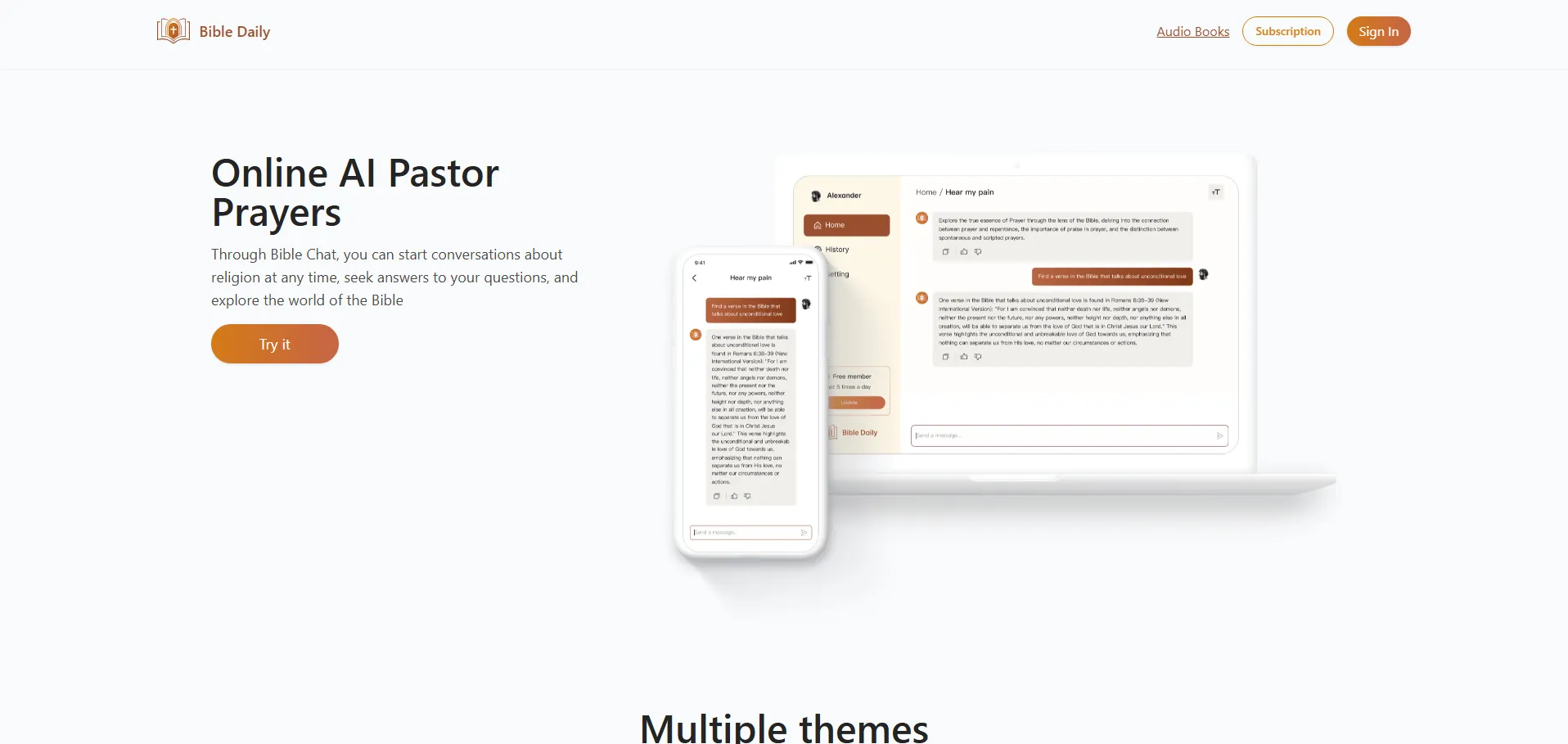 Bible Daily es una herramienta de chat bíblico impulsada por inteligencia artificial, diseñada para explorar textos sagrados, doctrinas y prácticas de fe. Permite iniciar conversaciones sobre temas bíblicos, obtener referencias y profundizar en la comprensión de la Escritura. Con disponibilidad 24/7, ofrece recursos de estudio, apoyo en la preparación de sermones y guía espiritual personalizada en cualquier momento.