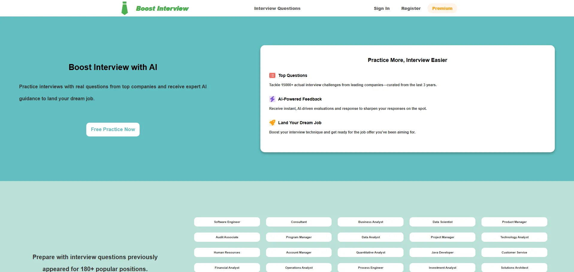 Boost Interview es una plataforma impulsada por inteligencia artificial especializada en la preparación de entrevistas de trabajo. Ofrece más de 15 000 preguntas reales extraídas de compañías líderes y proporciona retroalimentación instantánea impulsada por IA para perfeccionar respuestas, aumentar la confianza y maximizar las oportunidades de éxito. Con cobertura de más de 180 puestos populares, permite practicar diariamente y adaptar la preparación a objetivos específicos.