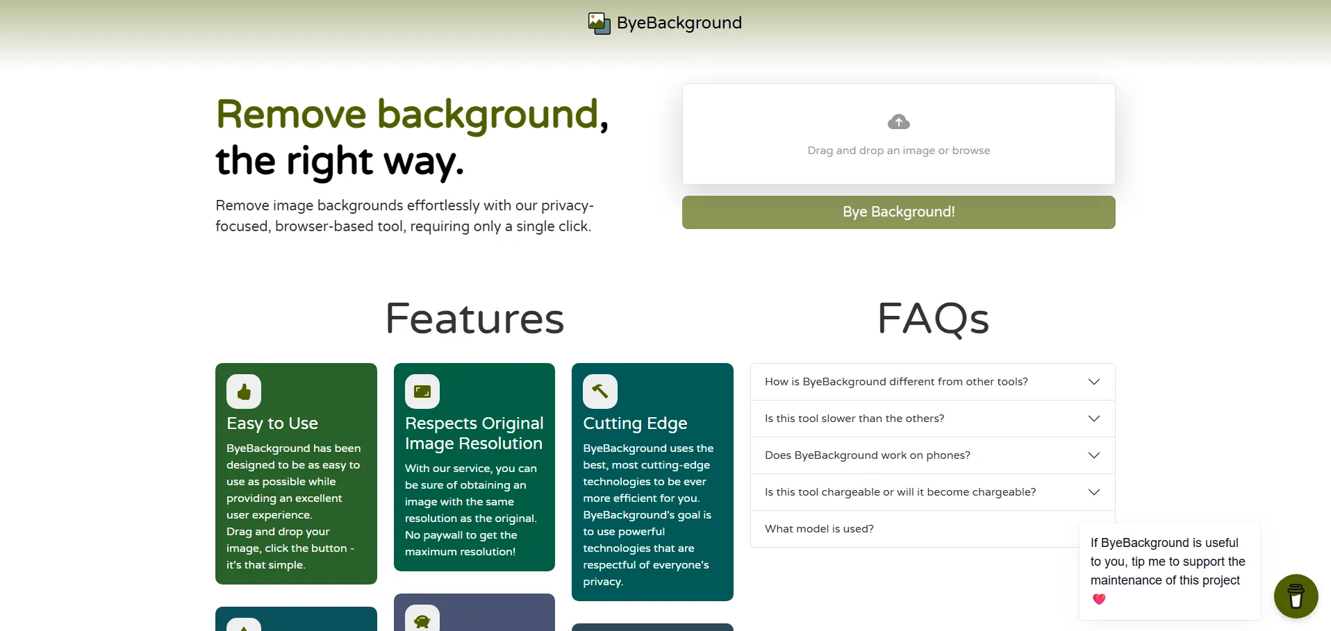 ByeBackground es una herramienta de inteligencia artificial basada en navegador, centrada en la privacidad, que elimina el fondo de las imágenes con un solo clic. Gracias a su funcionamiento local, las imágenes nunca abandonan tu equipo, manteniendo siempre la resolución original sin costes adicionales. Su interfaz de arrastrar y soltar y la ausencia de anuncios y rastreadores la convierten en una solución eficiente, ética y ecológica para todo tipo de usuarios.