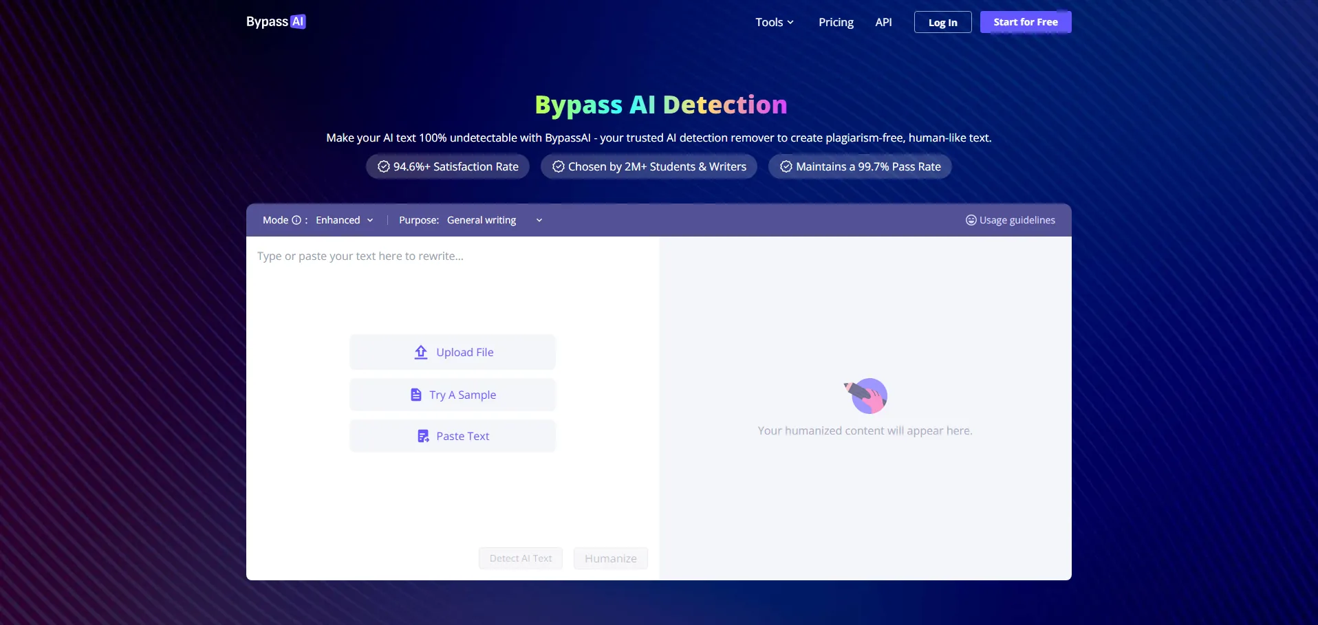 Bypass AI es un confiable eliminador de detección de IA que convierte contenido generado por inteligencia artificial en texto natural e indetectable. Emplea algoritmos avanzados para eliminar marcas de agua de herramientas como ChatGPT y evitar falsos positivos en detectores de IA. Garantiza que el contenido cumpla con las directrices de integridad de Google, suene auténtico y esté libre de plagio. Compatible con 30 idiomas, Bypass AI permite a creadores, profesionales y estudiantes ofrecer textos humanizados adaptados a audiencias globales.