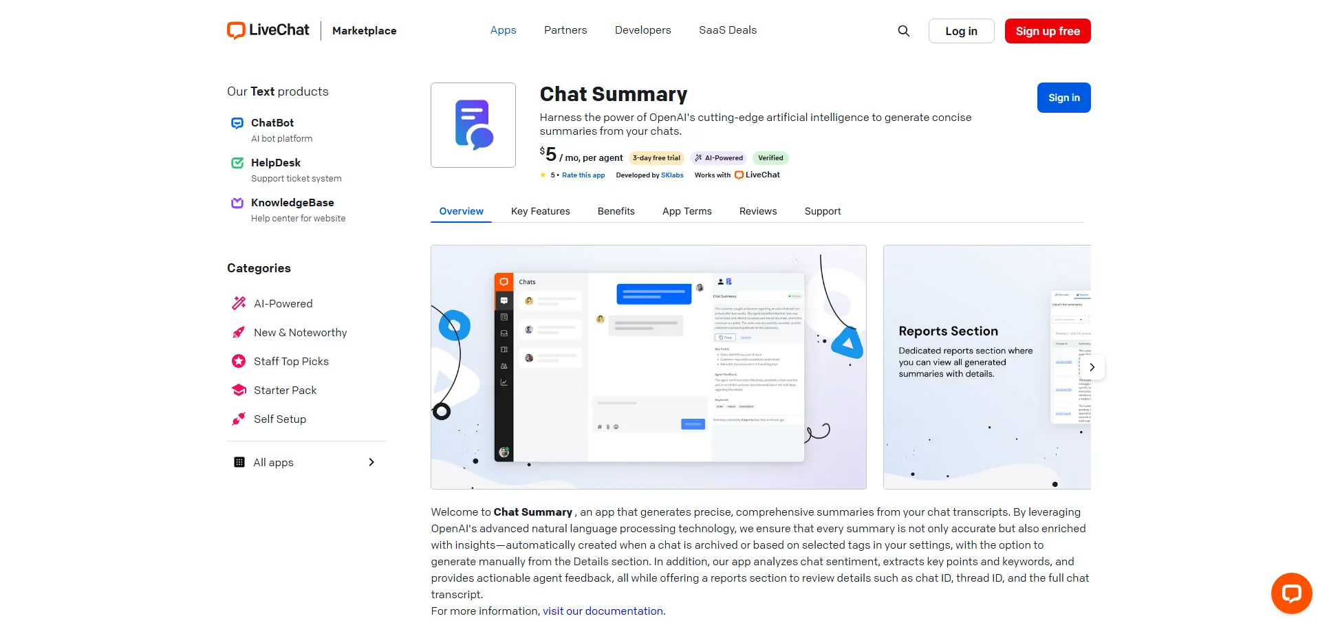 Chat Summary para LiveChat es una solución de inteligencia artificial que crea automáticamente resúmenes de transcripciones de chats, permitiendo extraer los puntos clave sin leer cada mensaje. Gracias al procesamiento de lenguaje natural de OpenAI, ofrece alta precisión y coherencia. Incluye un paquete de tokens gratuito para comenzar y permite adquirir más tokens directamente en la aplicación. Además, cuenta con un panel de informes donde consultar el historial de resúmenes, supervisar el uso y controlar el saldo de tokens para maximizar la eficiencia y transparencia.