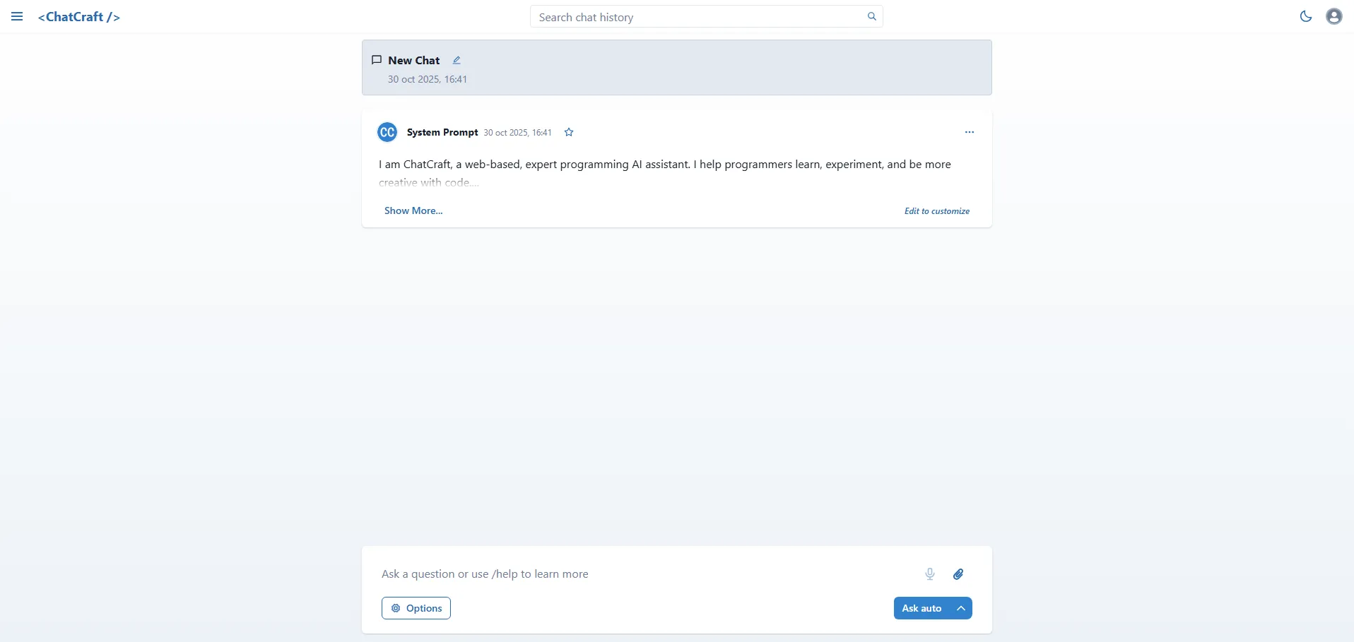 Chatcraft es un complemento web de código abierto para programar con grandes modelos de lenguaje (LLM) como GPT. Diseñado para desarrolladores, transforma la forma de interactuar con IA, permitiendo leer, escribir, depurar y mejorar código con soporte para múltiples proveedores de IA (OpenAI, OpenRouter, Anthropics, Google, Meta). Con vistas previas de diagramas de sirena y HTML, indicaciones personalizadas y la capacidad de crear funciones propias, Chatcraft ofrece una experiencia flexible para aprender, experimentar y colaborar en proyectos de programación.