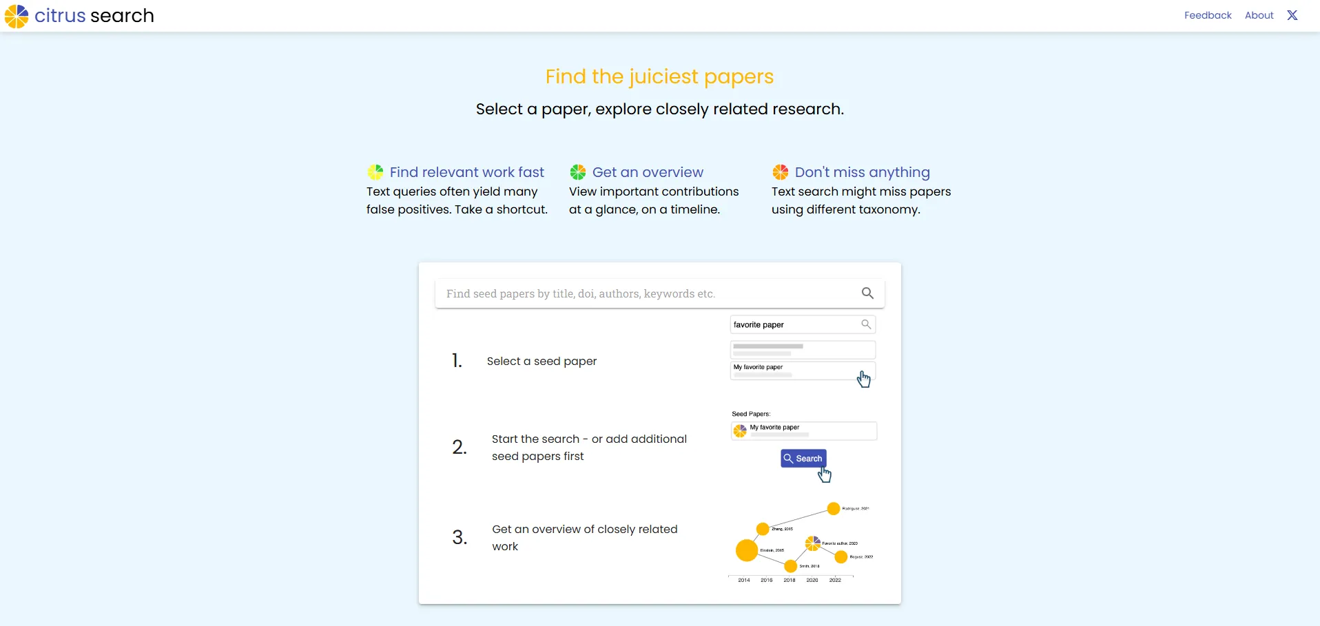 Citrus Search es un motor de búsqueda avanzado diseñado para explorar de manera precisa y rápida la literatura científica. Aprovecha algoritmos de similitud y un extenso corpus de Semantic Scholar (más de 200 millones de publicaciones y 2 mil millones de citas) para ofrecer resultados relevantes, minimizar falsos positivos y presentar una visión cronológica de los avances más importantes en cada disciplina.
