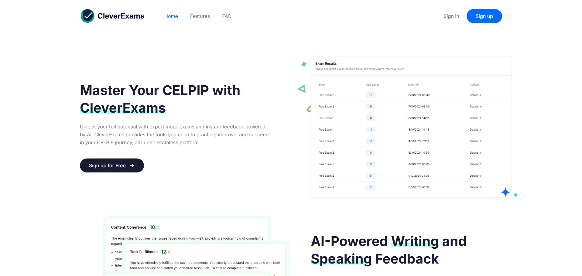 CleverExams es una plataforma de preparación para el examen CELPIP que ofrece simulacros realistas, análisis y retroalimentación impulsada por IA. Permite a los aspirantes practicar con limitaciones de tiempo oficiales y recibir correcciones inmediatas en habilidades de escritura y expresión oral. Con informes de progreso detallados, ayuda a identificar puntos débiles y medir la evolución del rendimiento para una preparación más efectiva y focalizada.
