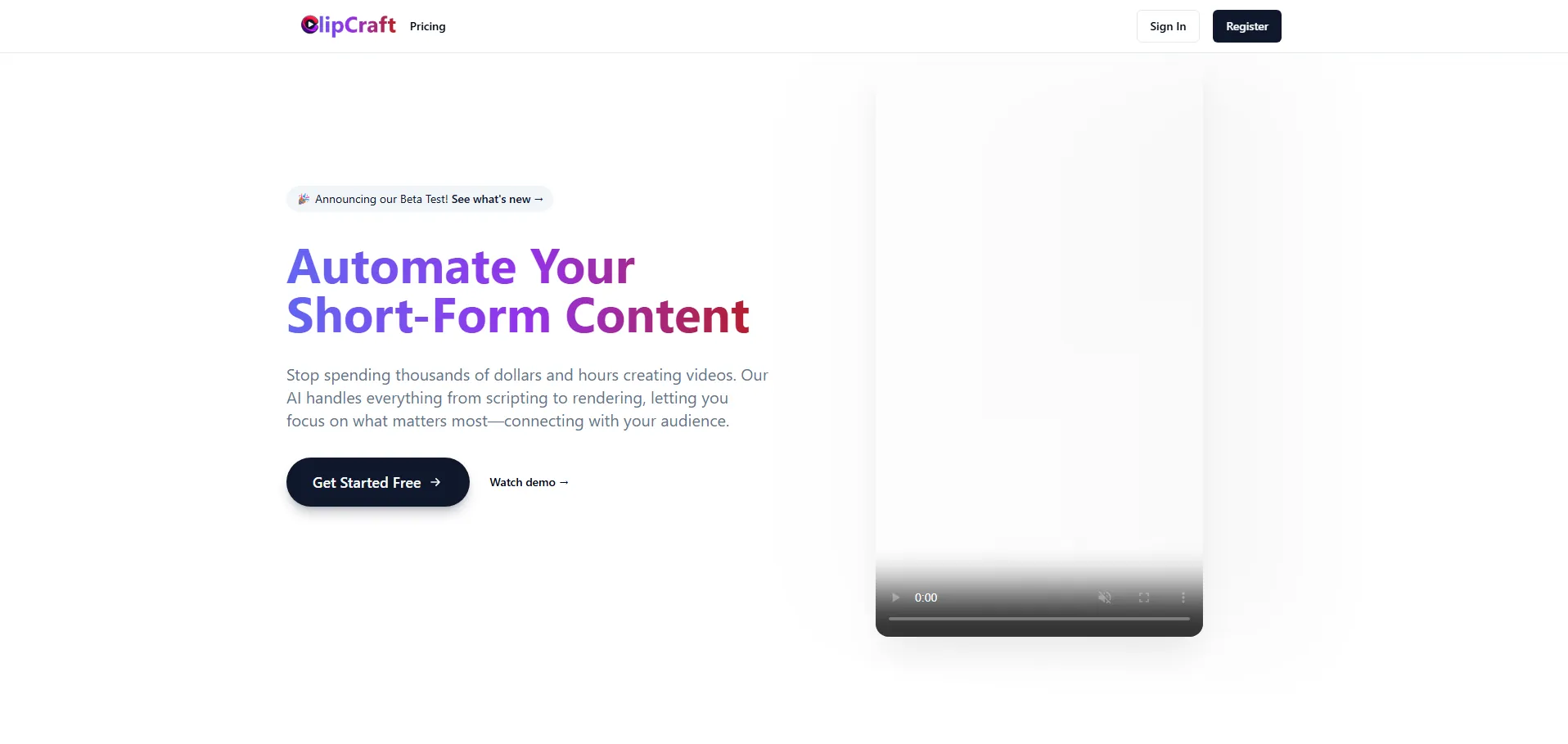 ClipCraft es una plataforma impulsada por inteligencia artificial que automatiza la creación de contenido de video de corta duración. Con herramientas de generación de guiones y renderizado en 4K, permite ahorrar tiempo y reducir costos en la producción audiovisual. Ofrece ideas ilimitadas de contenido creativo adaptadas a la marca y al público objetivo, junto a una biblioteca de más de 1000 avatares personalizables y acceso a más de 1000 voces multilingües con entonaciones naturales.