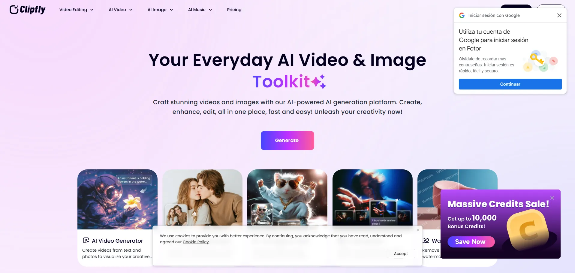 Clipfly es un generador de video con IA que facilita la creación de videos profesionales sin necesidad de habilidades avanzadas ni equipos costosos. Convierte texto en clips dinámicos en segundos, incorpora efectos generados por IA, música, imágenes y material de archivo. Con funciones como rotación, volteo, fusión de videos, filtros avanzados y mejora automática de calidad, Clipfly potencia la interacción, atrae clientes y acelera tus ventas con contenido visual de alto impacto.