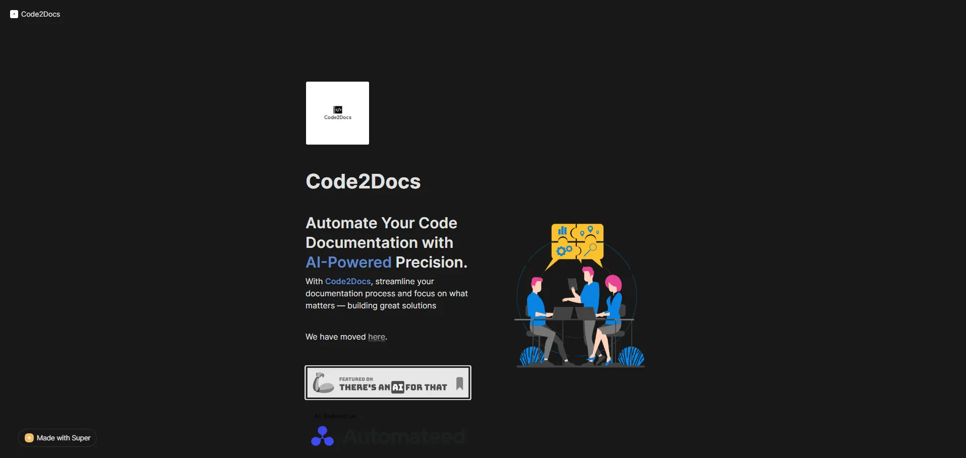 Code2Docs es una solución de documentación de código potenciada por inteligencia artificial que automatiza la generación de guías de usuario, documentación de API e instrucciones de prueba. Con una integración directa con GitHub y una interfaz intuitiva, convierte bases de código complejas en documentos claros y personalizables, reduciendo la deuda técnica y permitiendo a los equipos centrarse en el desarrollo de funcionalidades.