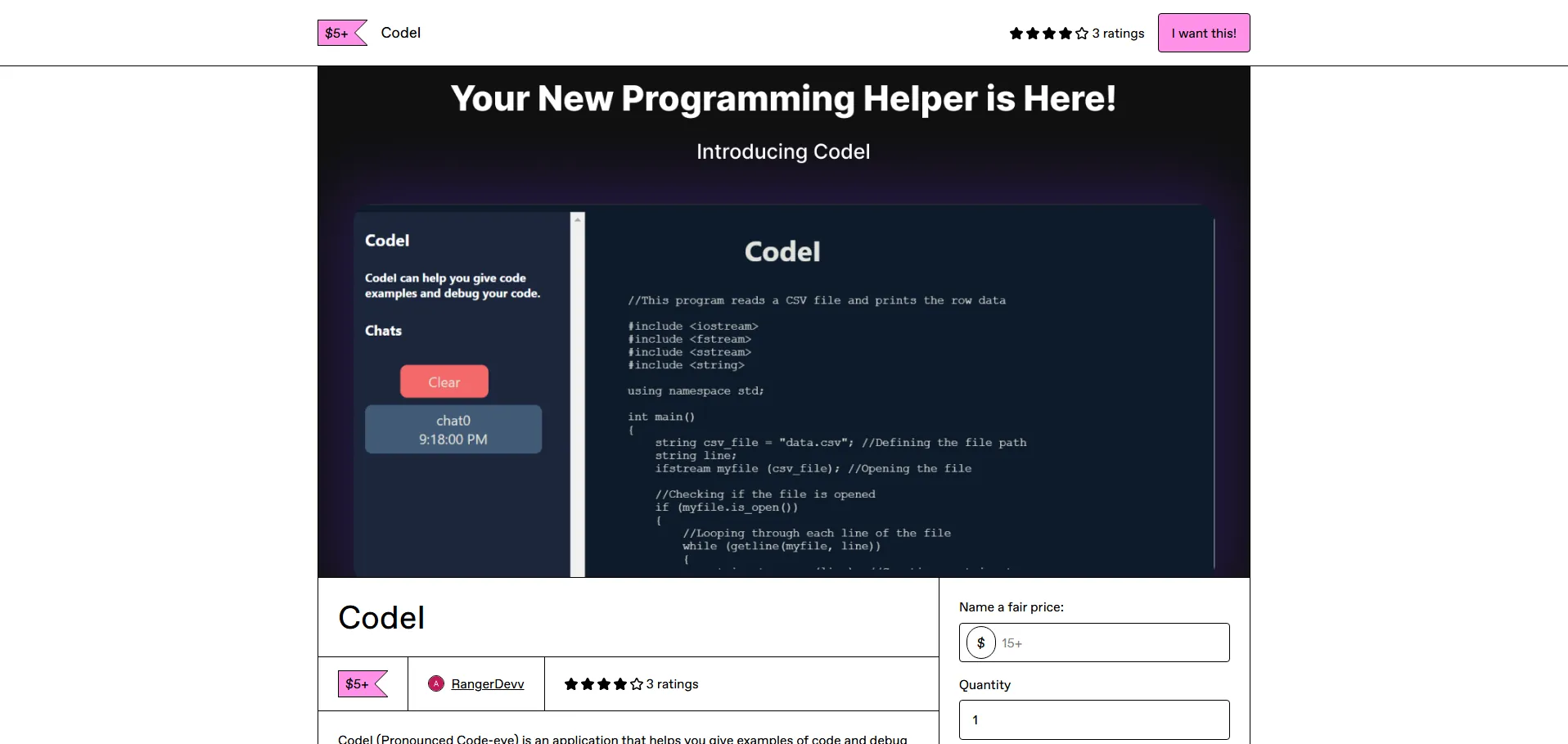 Codel es una solución potenciada por inteligencia artificial que facilita a los desarrolladores la búsqueda de fragmentos de código optimizados para depuración, implementación de funciones y aprendizaje de nuevos lenguajes o frameworks. Gracias a su interfaz intuitiva y su sistema de ejemplos previos accesibles, simplifica la comprensión de mensajes de error y acelera la resolución de problemas. Con una opción de pago único para acceso ilimitado de por vida y una clave API gratuita, Codel está diseñado para ahorrar tiempo y mejorar la calidad de los proyectos de software.