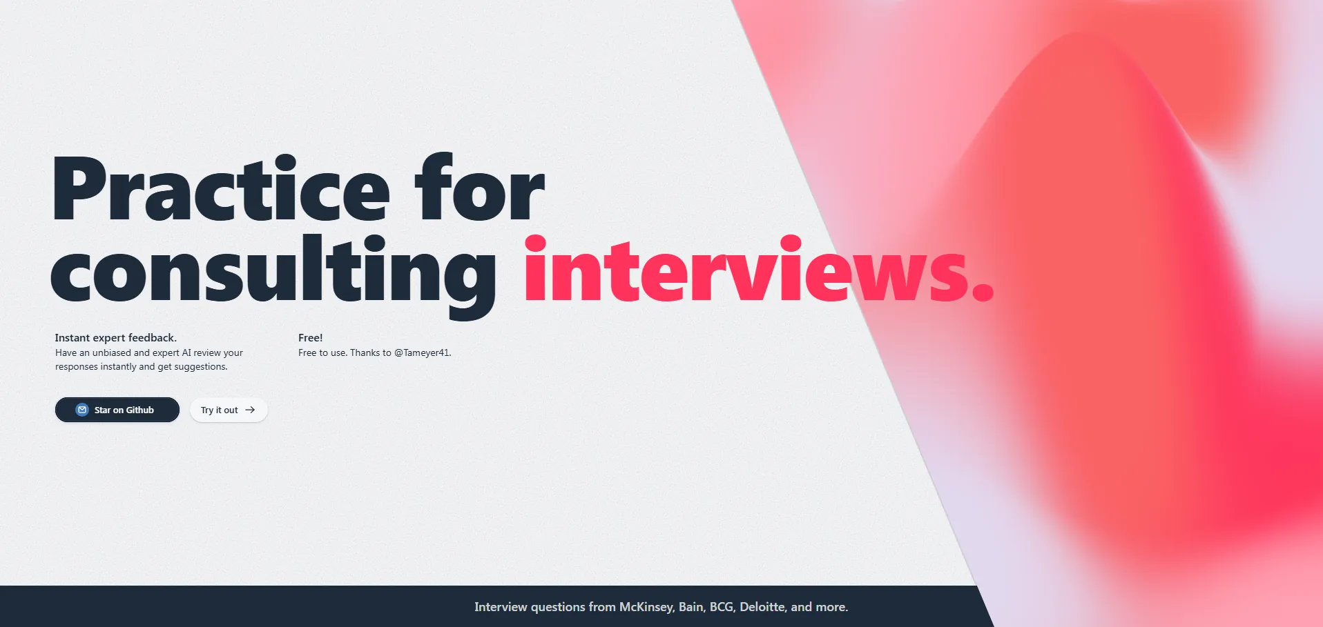 Consultan AI es una plataforma gratuita impulsada por inteligencia artificial, diseñada para entrenar entrevistas de consultoría con escenarios realistas. Combina retroalimentación instantánea de expertos con revisión objetiva de IA, ofreciendo sugerencias precisas para perfeccionar respuestas y estructurar casos. Su interfaz intuitiva y recursos completos la convierten en una referencia dentro de la comunidad de consultoría.
