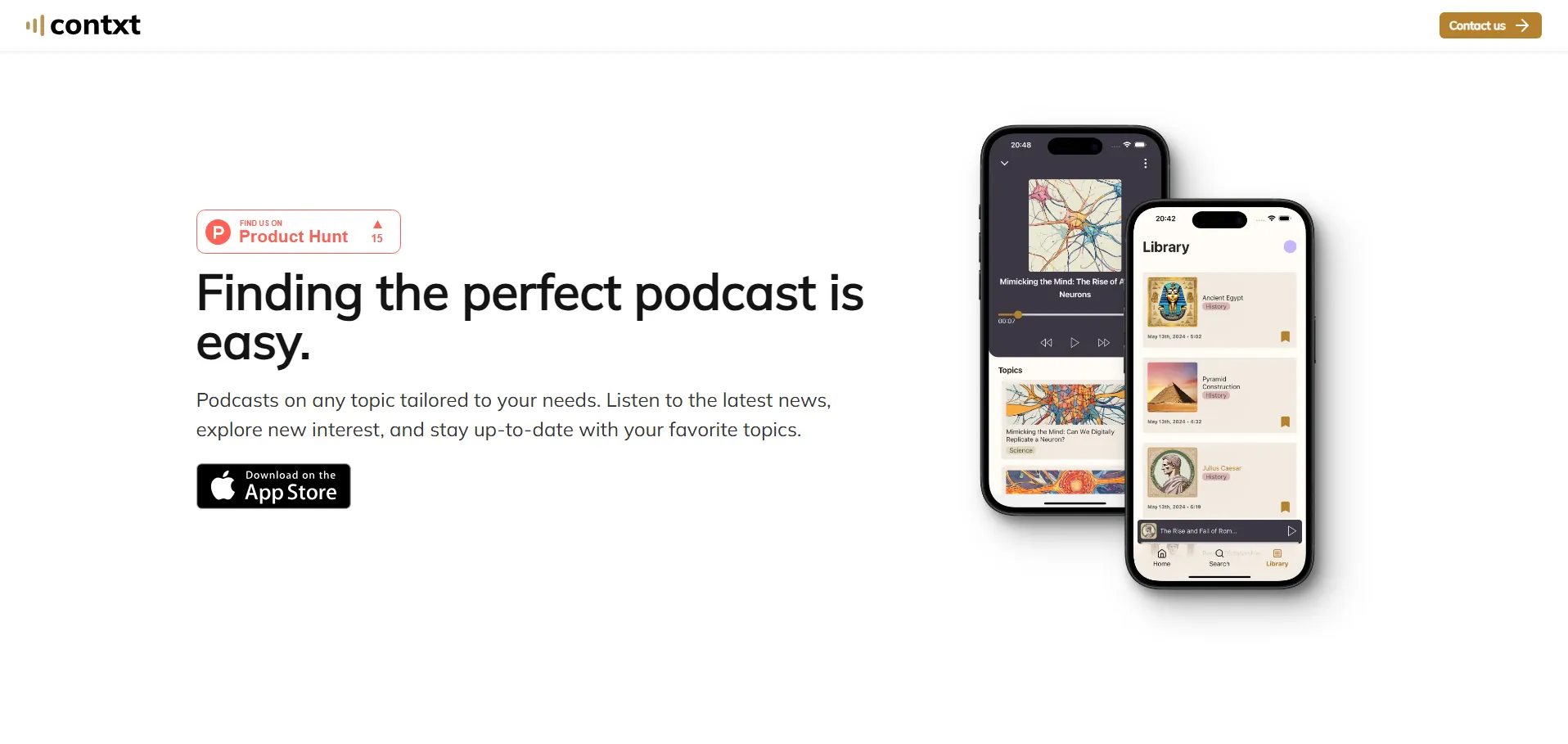 Contxt es una plataforma de generación de podcasts con IA que crea contenido de audio personalizado según los intereses y preferencias del usuario. Con episodios de aproximadamente seis minutos, ofrece información concisa para facilitar el aprendizaje y la retención. Su amplia biblioteca permite marcar, organizar y descubrir temas, mientras las recomendaciones y la categorización inteligente evitan la sobrecarga de información. Además, integra una comunidad activa en Discord para compartir ideas y sugerencias.