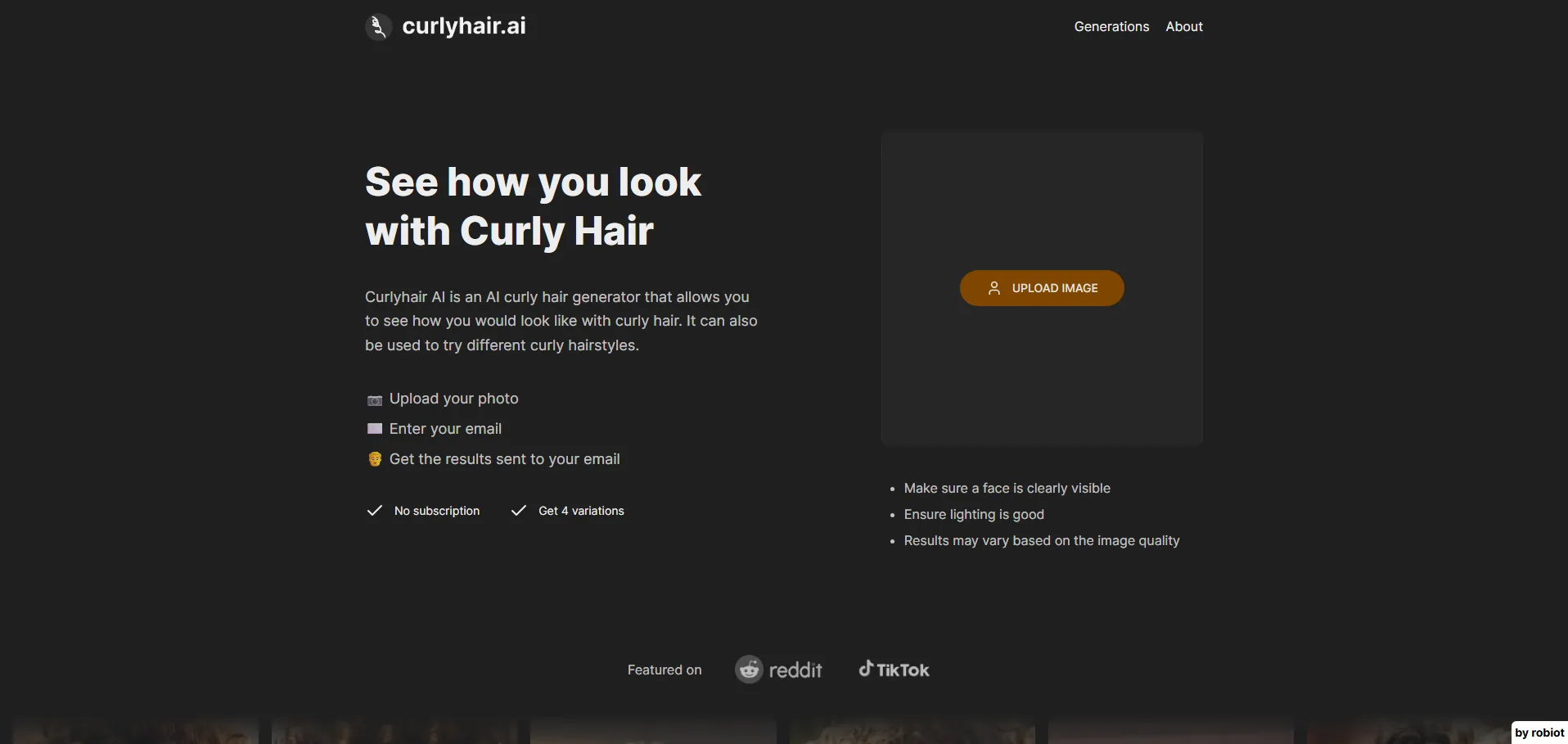 CurlyHair AI es una herramienta impulsada por inteligencia artificial que genera imágenes realistas de peinados rizados a partir de una foto. El sistema optimiza la visibilidad del rostro y recomienda una buena iluminación para obtener resultados de alta calidad. Con solo subir tu imagen y proporcionar un correo electrónico, recibirás cuatro variaciones de rizos para explorar nuevos looks y acceder a inspiración de peinados directamente en la plataforma.