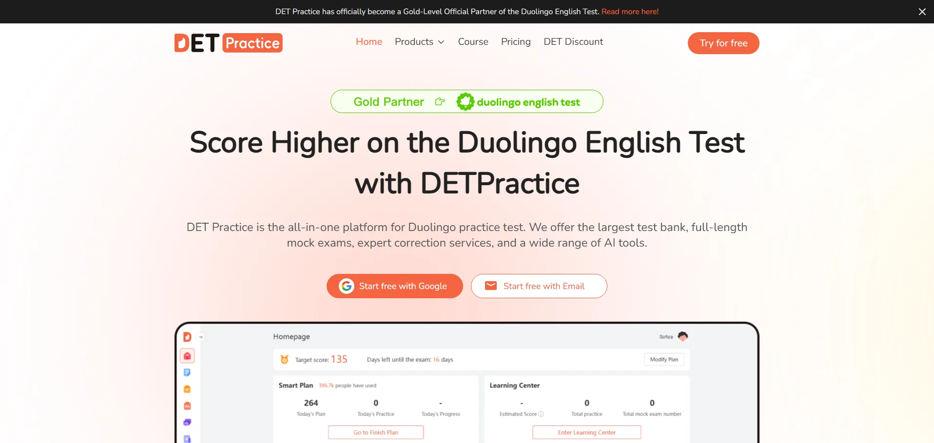DET Practice es una plataforma especializada en la preparación del Duolingo English Test. Con un banco de más de 18 000 preguntas actualizado periódicamente, ofrece simulacros que replican con precisión el formato oficial, corrección automatizada por IA en tareas de expresión oral y escrita, resultados instantáneos y cursos con estrategias clave para cada sección del examen.