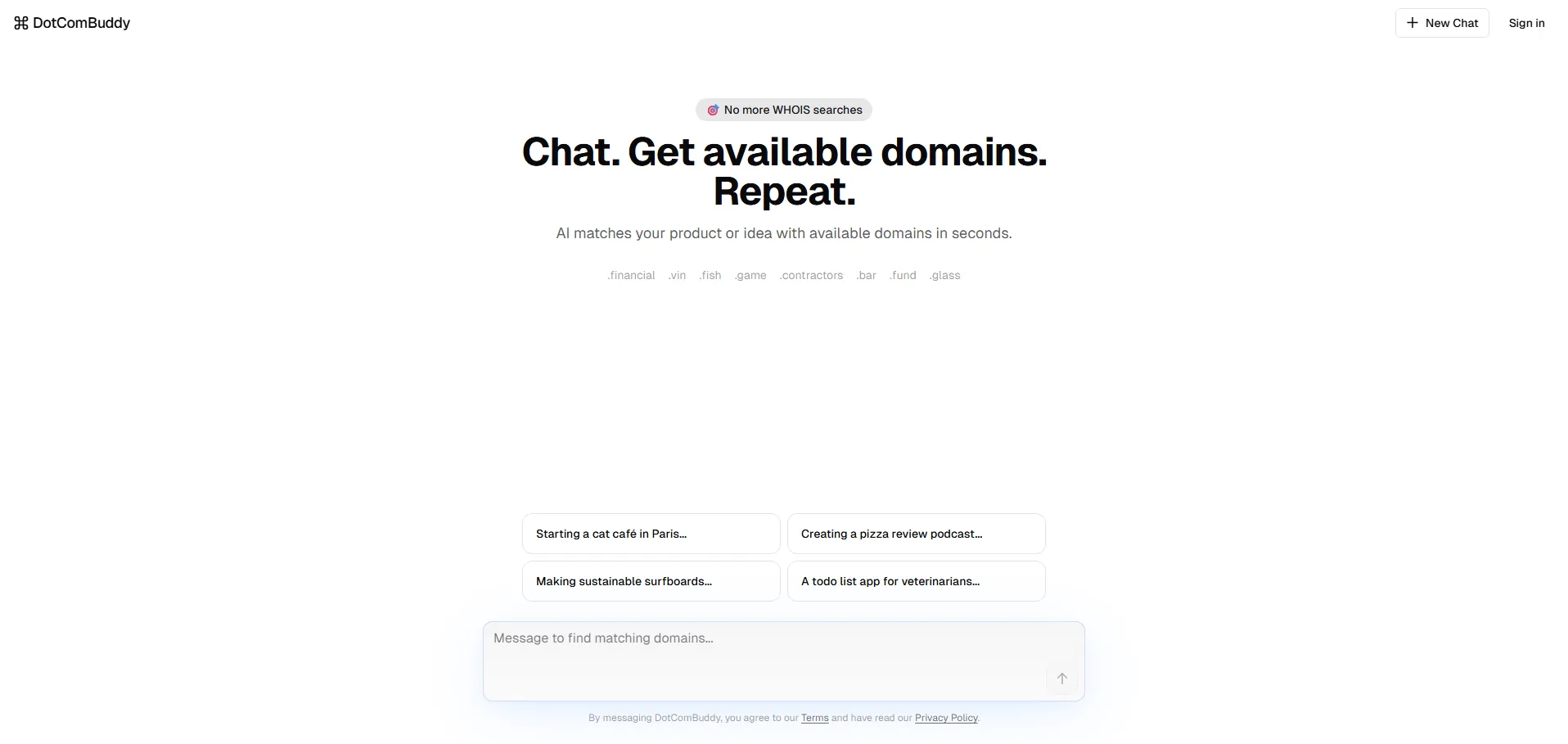 DotComBuddy es un generador de nombres de dominio potenciado por inteligencia artificial que agiliza la elección del dominio ideal. Analiza al instante tus ideas o conceptos y verifica la disponibilidad en múltiples extensiones (.com, .club, .company y más). Gracias a su chat integrado, puedes resolver dudas y ajustar criterios en tiempo real, asegurando una presencia online profesional y memorable.