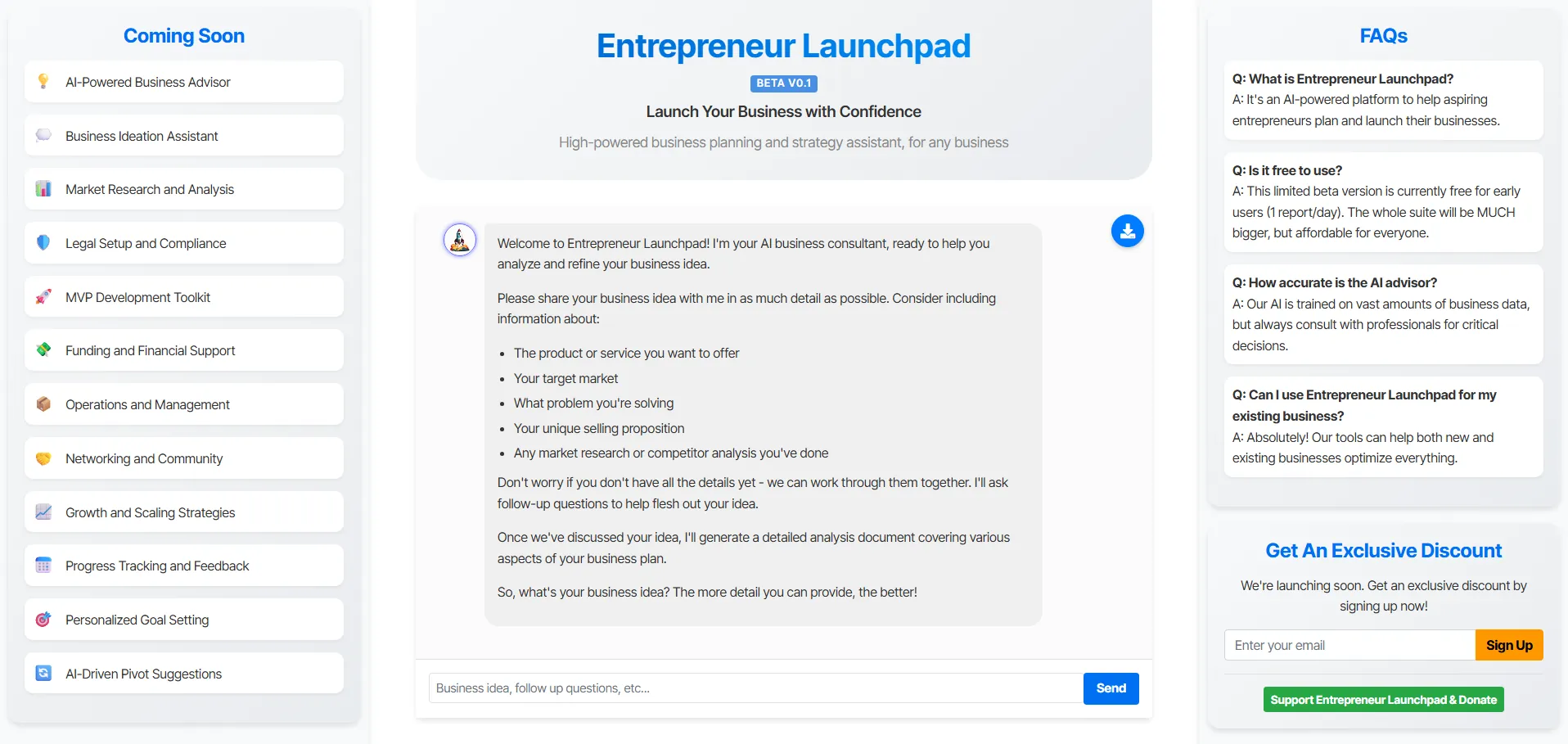 Entrepreneur Launchpad es una plataforma de estrategia empresarial impulsada por inteligencia artificial que guía a emprendedores en cada etapa de su proyecto. Facilita la generación y validación de ideas, el análisis de mercado, el cumplimiento normativo y el desarrollo de productos mínimos viables (MVP). Con seguimiento de objetivos personalizados y sugerencias de pivote basadas en IA, agiliza la planificación, el lanzamiento y la expansión de negocios, además de ofrecer oportunidades de networking con mentores e inversores.