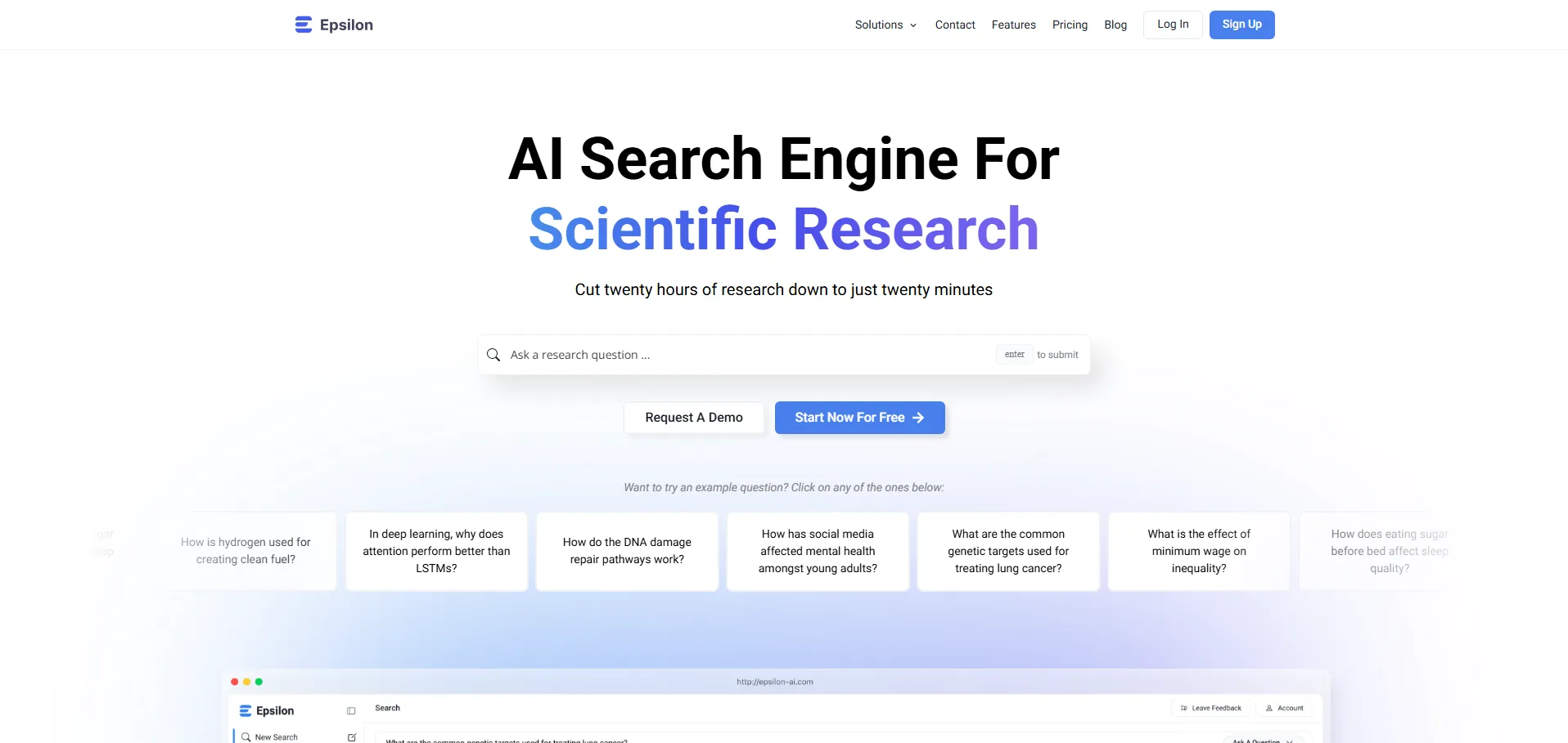 Epsilon es un motor de búsqueda impulsado por inteligencia artificial, diseñado para acelerar la investigación científica. Ofrece acceso inmediato a una vasta biblioteca de literatura académica y patentes, permitiendo formular preguntas complejas y obtener respuestas con referencias automáticas. Con tecnología GPT-4 y datos de Semantic Scholar, garantiza resultados precisos y actuales, mientras protege la privacidad de los usuarios mediante el anonimato de consultas y el almacenamiento seguro de datos. Sus funciones de agrupación de resultados, creación de bibliotecas personales y síntesis de artículos convierten a Epsilon en una herramienta esencial para investigadores y académicos.